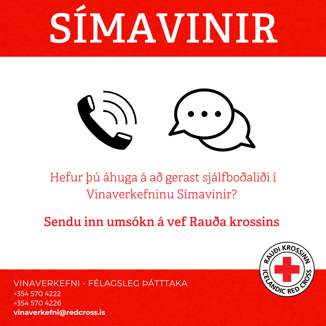 Rauði kross Íslands er með í gangi svokölluð Vinaverkefni. „Markmið allra Vinaverkefna RKÍ er að rjúfa félagslega einangrun fólks með því að veita félagsskap/nærveru og hlýju. Sjálfboðaliðastarfið er unnið út frá þörfum notanda hverju sinni og útfærslur verkefnisins eru því fjölbreyttar,“ segir í tilkynningu þar sem fólk er hvatt til að sækja um að gerast sjálfboðaliðar við verkefnið.