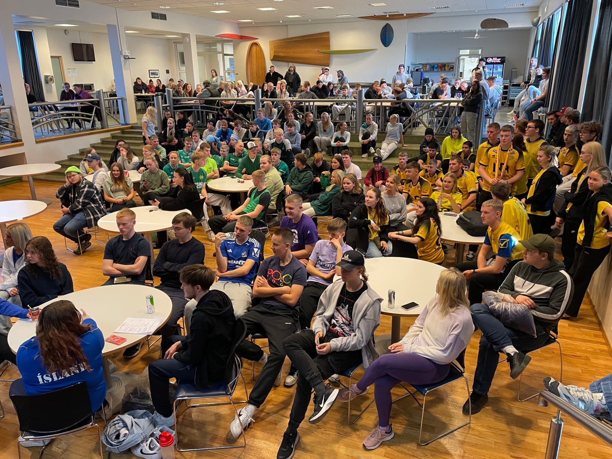 Hið árlega skammhlaup fór fram í gær í Fjölbrautaskóla Vesturlands á Akranesi og birti Skessuhorn í gær myndasyrpu frá keppni í óhefðbundnum íþróttagreinum á Jaðarsbökkum þar sem vel var tekist á. Eftir það var haldið á sal FVA þar sem liðin sex sem voru að taka þátt kepptu meðal annars í spurningaleiknum „Kahoot!,“ planki, að verpa eggjum, „silly walk“ og hópsöng. Þegar stigin höfðu verið talin kom í ljós að gula liðið var sigurvegari og gátu þau fagnað sigrinum á Skammhlaupsballinu sem var haldið í sama sal seinna um kvöldið. Þar komu fram prettyboitjokko og dj Marinó og skemmtu nemendum skólans fram á miðnætti.