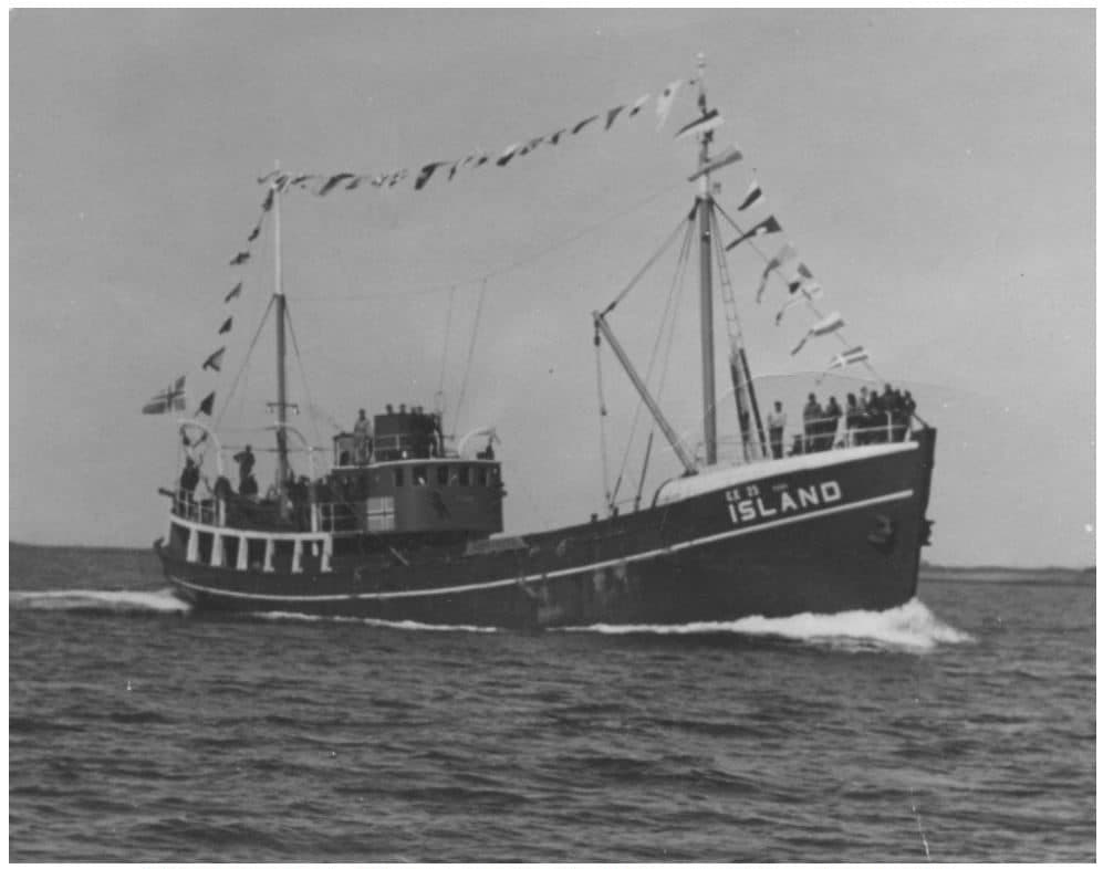 Vélbáturinn Edda GK siglir hér nýsmíðaður og fánum prýddur líklega árið 1944. Báturinn var smíðaður í skipasmíðastöðinni Dröfn. Ljósm. ferlir.is