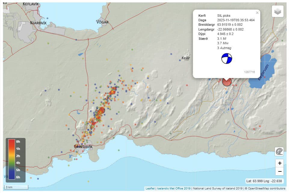 „Áfram mælist smáskjálftavirkni yfir kvikuganginum, norð-norðaustur af Grindavík. Um 370 jarðskjálftar mældust þar síðustu nótt. Í gær mældust rétt um 1800 skjálftar yfir kvikuganginum. Engin teljandi merki eru um breytta virkni yfir ganginum í nótt og gosórói hefur ekki mælst á jarðskjálftamælum okkar á svæðinu,“ segir í tilkynningu frá náttúruvárhópi Veðurstofunnar.