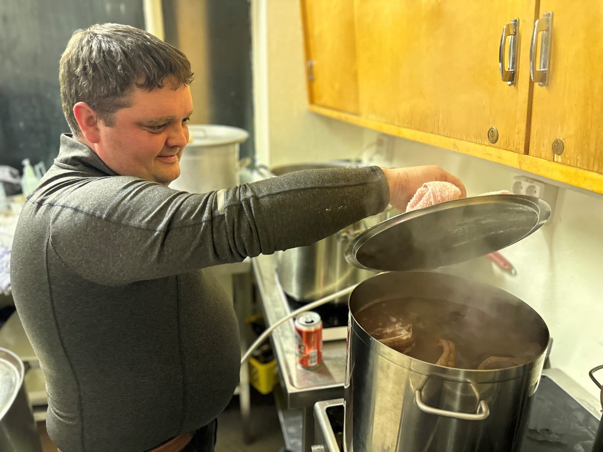 Þorvaldur Árnason á Skarði hugar hér að síðustu sviðasuðunni, en veisluföng af þessu tagi eru býsna fyrirferðarmikil og þurfti að tjalda til öllum stórum pottum í sveitinni. Ljósm. mm