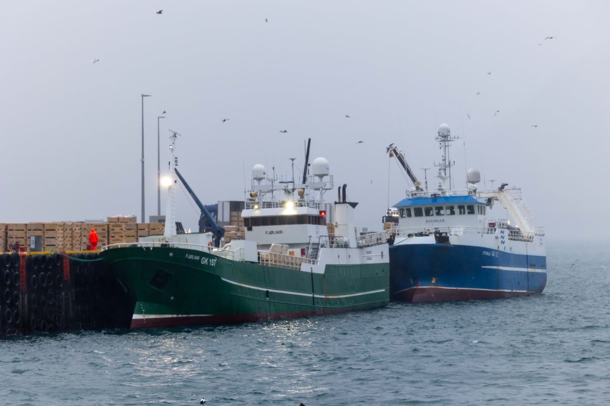 Fjölnir GK og Sturla GK liggja við landfestar á meðan sitt hvort löndunargengið er að landa úr þeim. Texti og myndir: TFK