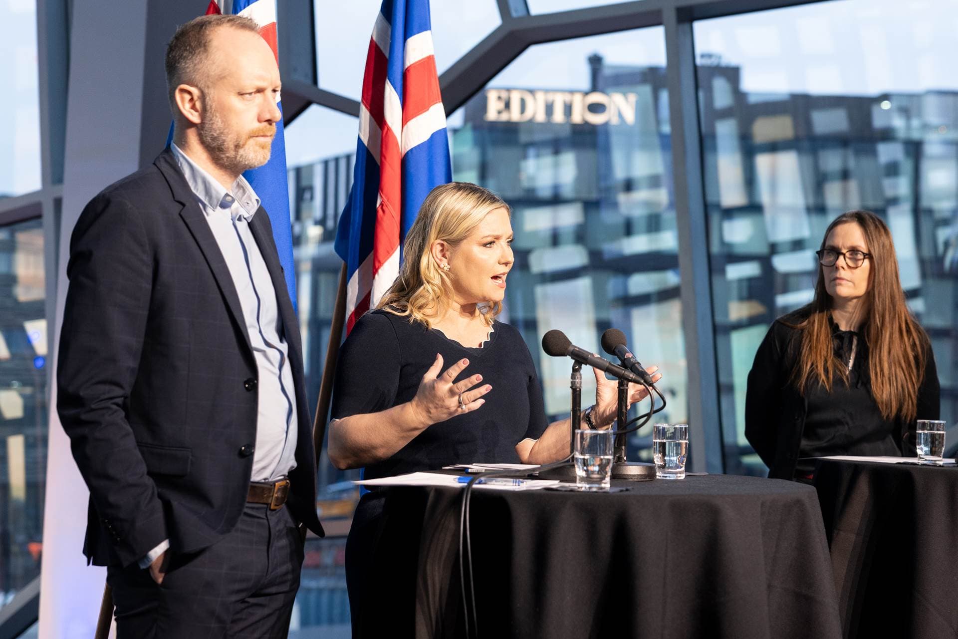 Guðmundur Ingi Guðbrandsson félags- og vinnumarkaðsráðherra, Lilja Dögg Alfreðsdóttir menningar- og viðskiptaráðherra og Katrín Jakobsdóttir forsætisráðherra kynntu tillögur ráðherranefndarinnar í dag. Ljósm. Stjórnarráðið
