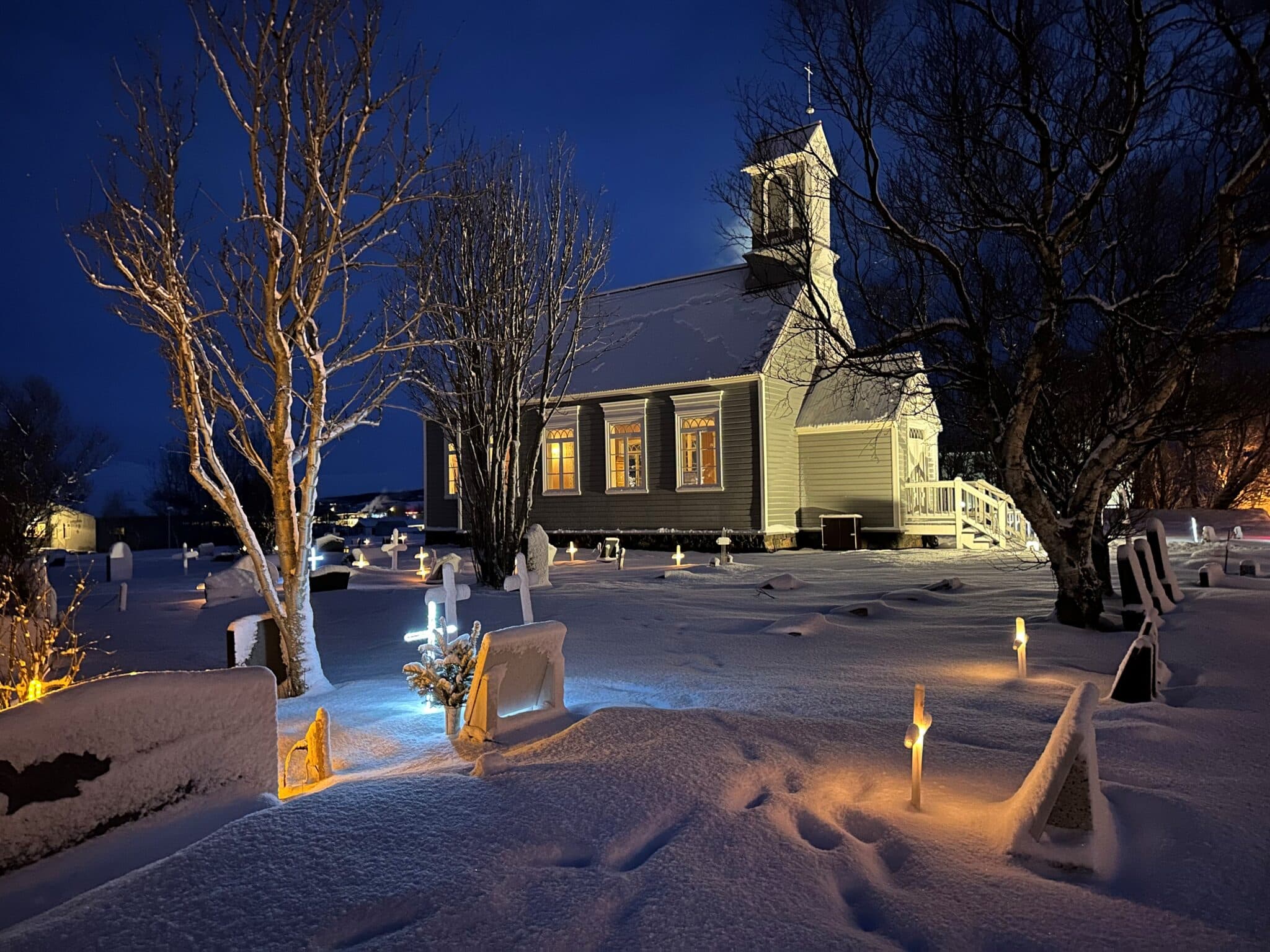 Gamla kirkjan í Reykholti í Borgarfirði á aðventunni. Ljósm. mm