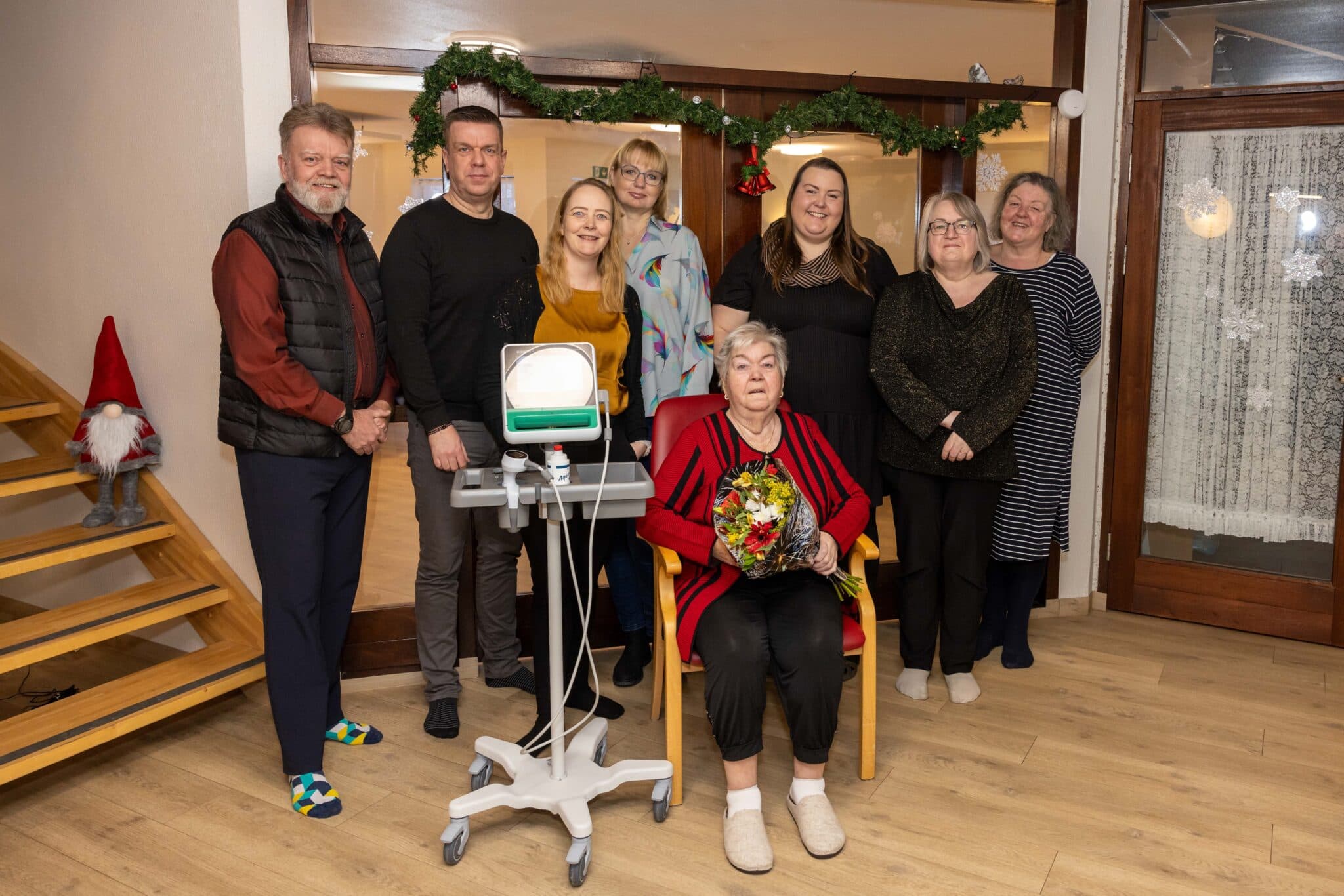 Eygló ásamt börnum sínum og starfsmönnum. F.v. Vilhjálmur Wium, Davíð Wium, Jóhanna Þorvarðardóttir, Vineta Karimovs hjúkrunarfræðingur, Eygló Guðmundsdóttir, Rakel Birgisdóttir starfsmaður, Anna Júlía Skúladóttir starfsmaður og Patricia Laugesen forstöðumaður. Ljósm. tfk
