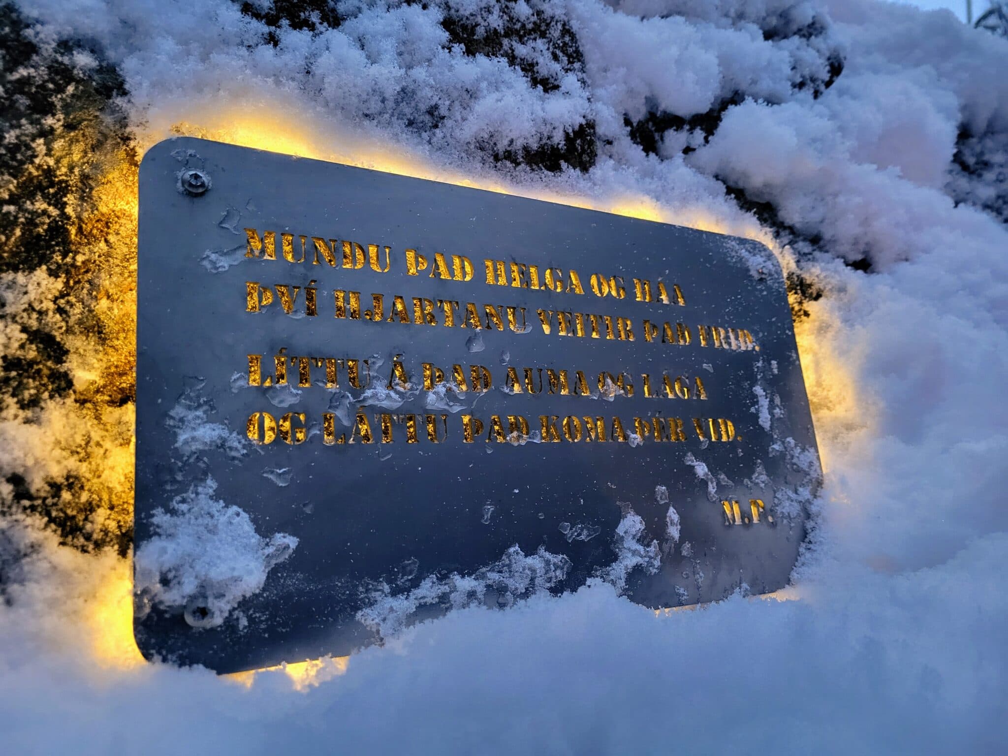 : Lýsingin á bak við skjöldinn nýtur sín vel í skammdegismyrkrinu. Ljósm. gj