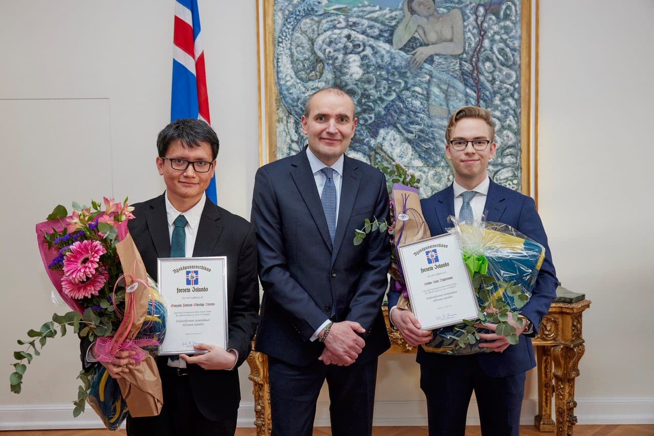 Nýsköpunarverðlaun forseta Íslands voru afhent við hátíðlega athöfn á Bessastöðum í gær. Verðlaunin hlutu Gonzalo Patricio Eldredge Arenas og Heiðar Snær Ásgeirsson fyrir verkefnið „Umhverfisvænt sementslaust AlSiment steinlím“. Báðir eru þeir meistaranemar; Heiðar Snær í efnaverkfræði við DTU Tækniháskólann í Danmörku en Gonzalo nemur jarðhitaverkfræði við Háskóla Íslands.