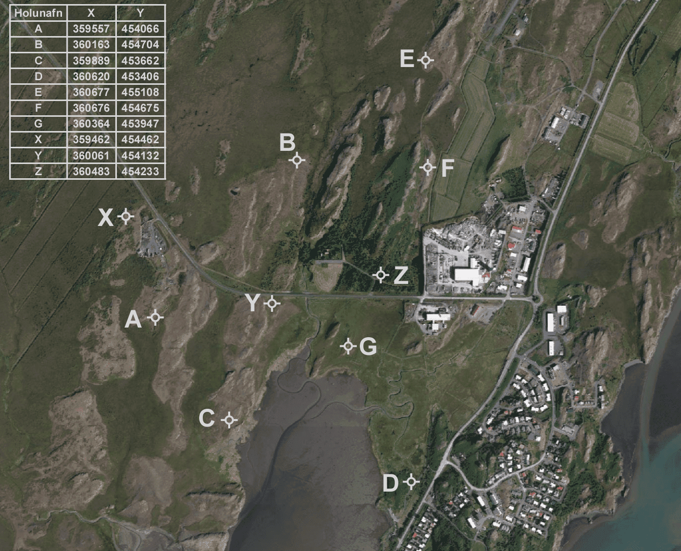 Loftmynd af svæðinu með holustaðsetningum. Einhverjar þurfti að færa lítillega til út frá aðgengi. Ljósm: Veitur.