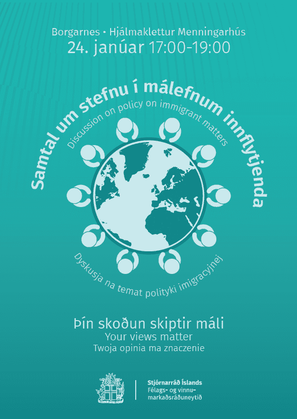 Félags- og vinnumarkaðsráðuneytið vinnur nú í fyrsta sinn að stefnu og framtíðarsýn í málefnum innflytjenda. Markmiðið er að fólk sem sest að hér á landi hafi tækifæri til inngildingar (e. inclusion) og virkrar þátttöku í samfélaginu og á vinnumarkaði. Samtal og samráð við íbúa, sérstaklega innflytjendur, er mikilvægt í þessari vinnu. Ráðuneytið býður því til samtals hringinn í kringum landið og eru innflytjendur sérstaklega hvattir til að mæta. Í nóvember voru vel heppnaðir fundir haldnir á Akureyri og Ísafirði og nú heldur samtalið áfram. Starfsfólk ráðuneytisins verður í Borgarnesi síðdegis í dag, miðvikudaginn 24. janúar kl. 17:00-19:00. Fundurinn fer fram í Hjálmakletti og er opinn öllum. Fundurinn verður túlkaður á ensku og pólsku.