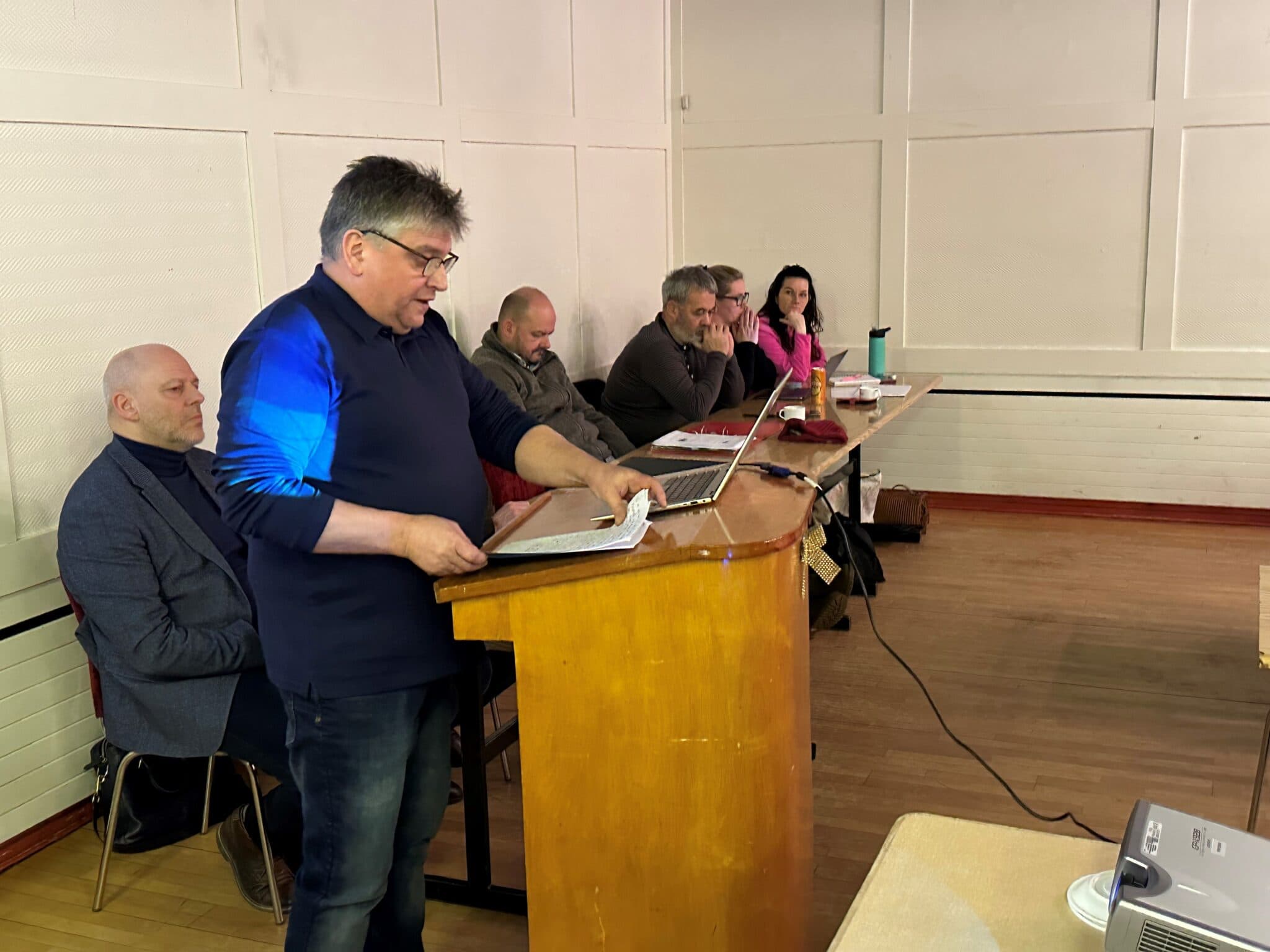 Jón E Einarsson oddviti flytur erindi sitt. Í pontu eru aðrir hreppsnefndarfulltrúar en Páll S Brynjarsson fundarstjóri lengst til vinstri. Ljósm. mm