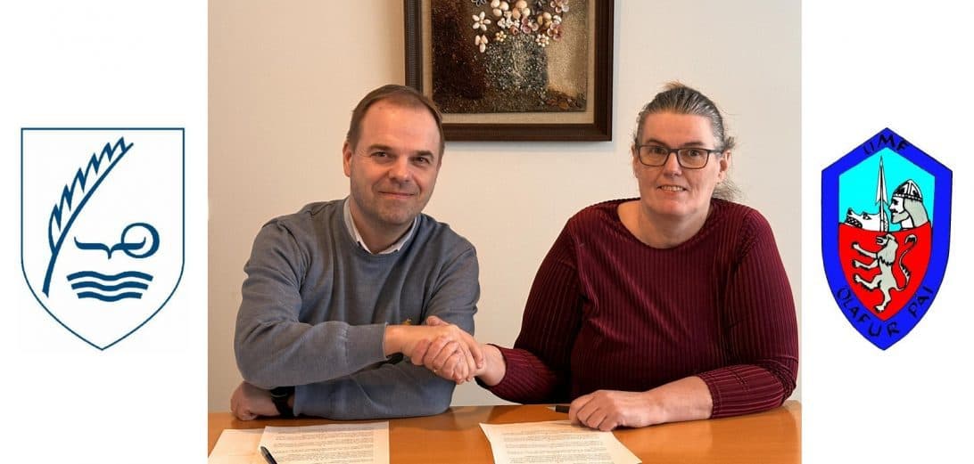 Björn Bjarki Þorsteinsson sveitarstjóri og Ingibjörg Jóhannsdóttir gjaldkeri ungmennafélagsins Ólafs pá við undirritun samningsins. Ljósm. dalir.is