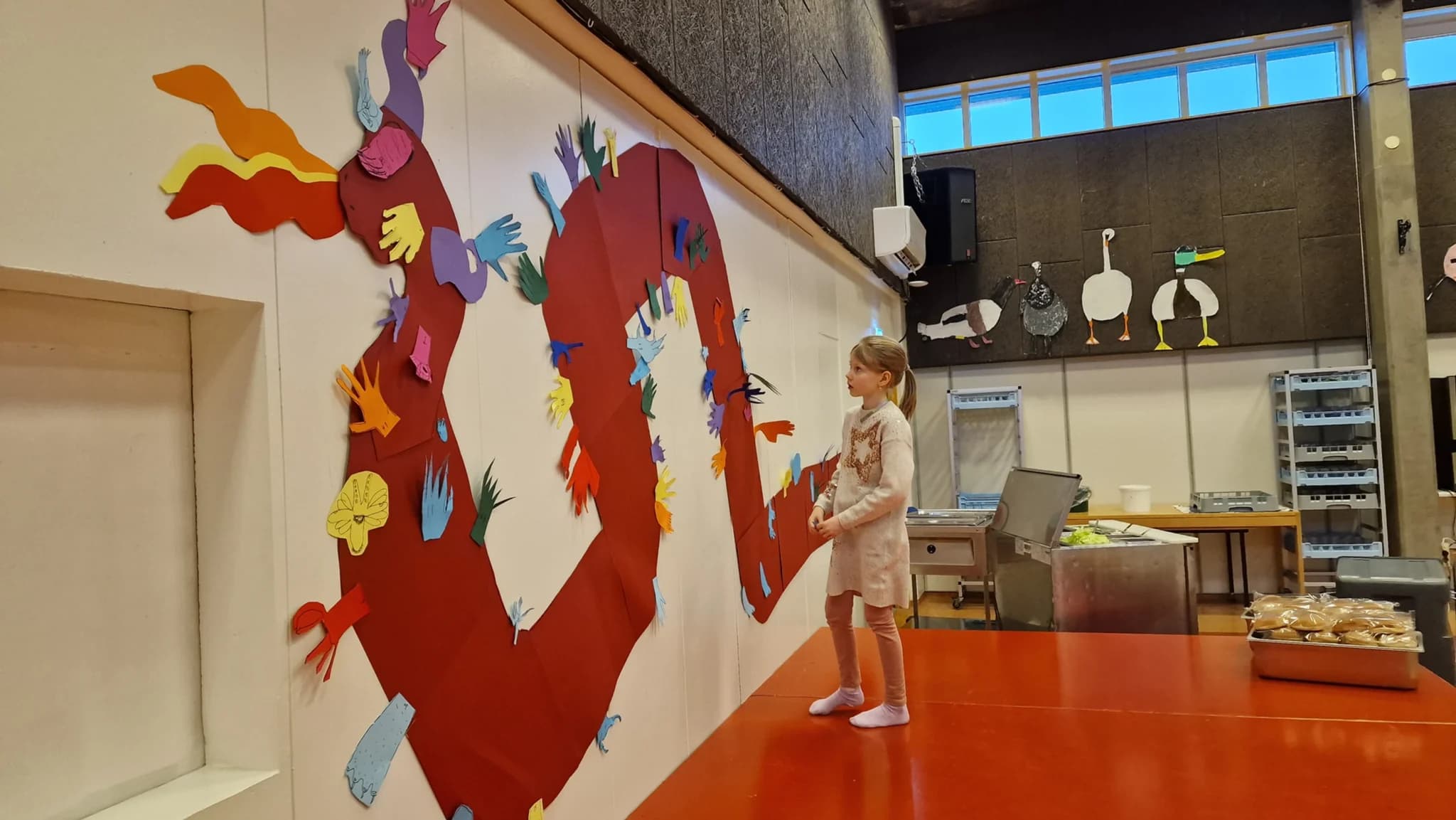 Skrímsli var búið til á vegg í skólanum. Ljósm. gsnb.is