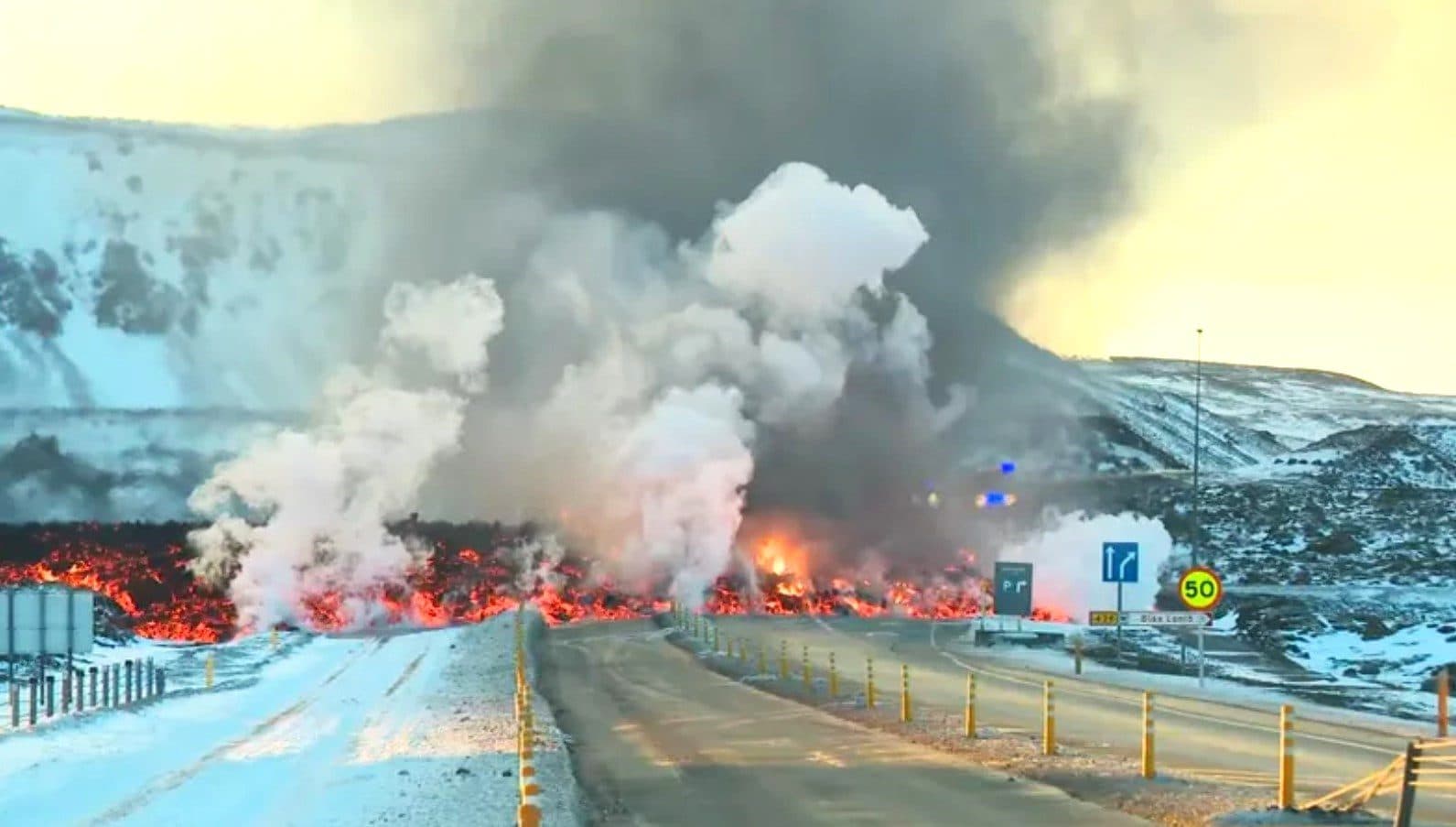 Hraunelfur frá eldgosinu sem hófst við Sundhnúka í morgun náði fyrir nokkru að rjúfa Grindavíkurveg á móts við afleggjarann að Bláa lóninu. Talið er að hraunstraumurinn nái eftir hádegi að heitavatnsæðinni sem fóðrar Suðurnes, ef ekki verður hægt að verja hana. Hættuástandi hefur því verið lýst yfir og mögulegt að heitt vatn fari af öllum Suðurnesjum.