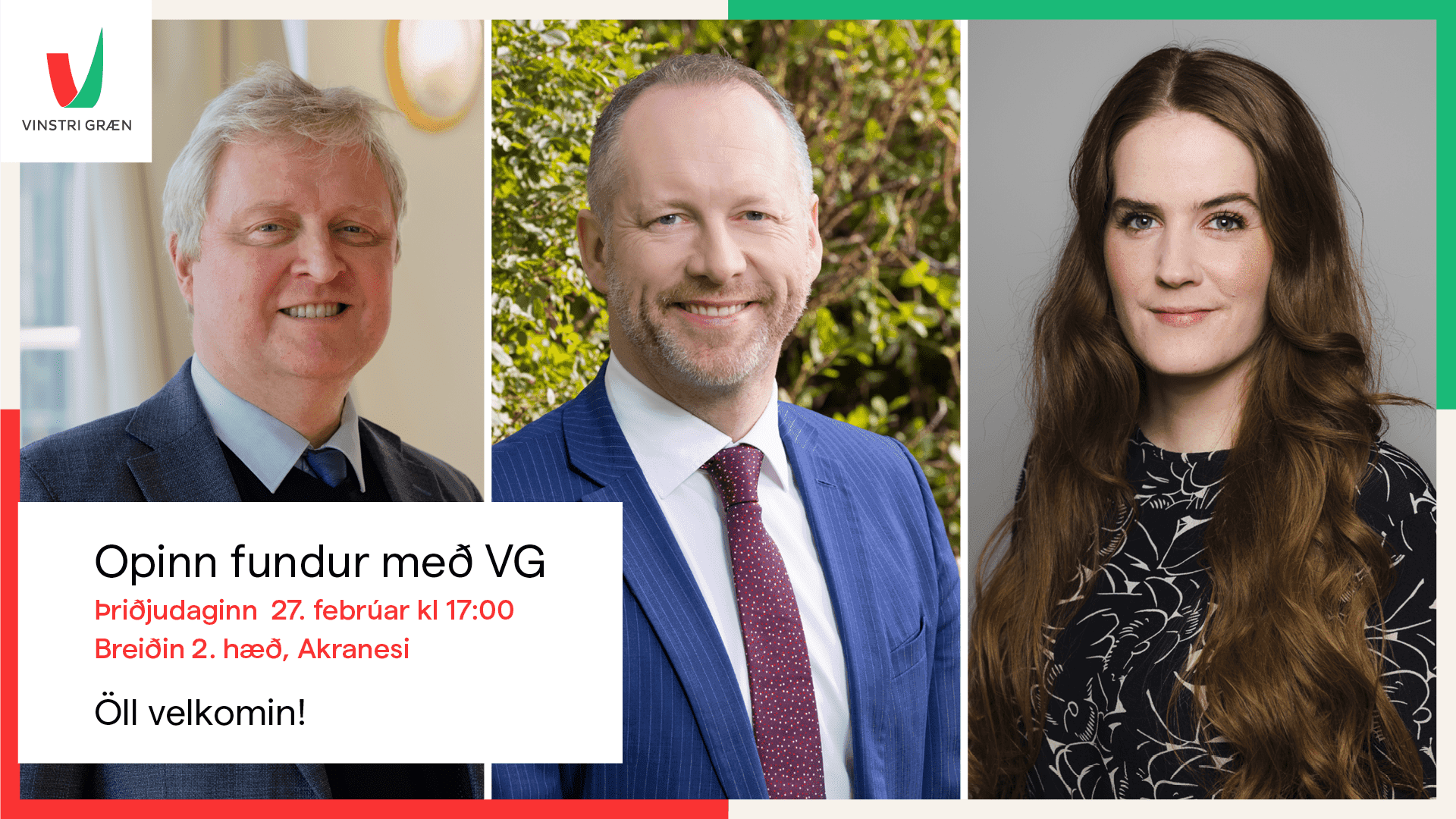 Kjördæmavika er framundan. Þingmenn VG munu mæta til fundar á Breiðinni á Akranesi þriðjudaginn 27. febrúar klukkan 17. Í tilkynningu segir: „Vinstri græn bjóða til samtals í fundaferð í kjördæmaviku. Í þetta sinn er ferðinni skipt upp í þrjá leggi og verðum við á Akranesi á þriðjudaginn næstkomandi. Fundirnir eru opnir öllum og býðst fólki að ræða við þingmenn og ráðherra og fá svör frá fyrstu hendi um málefni líðandi stundar. Allir velkomnir."