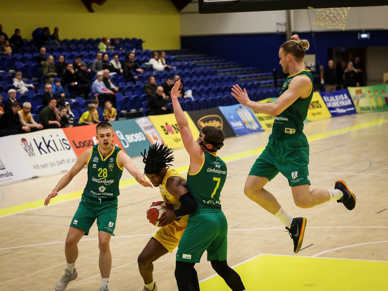 Fjölnir og Skallagrímur áttust við í 1. deild karla í körfuknattleik á föstudagskvöldið og var leikurinn í Dalhúsum í Grafarvogi. Fyrir leik var Fjölnir á toppi deildarinnar með 30 stig en Skallagrímur í 5. sæti með 18 stig. Í síðustu viðureignum liðanna höfðu Skallagrímsmenn haft betur og því spennandi að sjá hvort breyting yrði þar á. Gestirnir úr Borgarnesi byrjuðu betur en síðan skoraði Fjölnir sjö stig í röð og jafnt var eftir fimm mínútna leik, 13:13. Í stöðunni 17:17 skoruðu Skallarnir sex stig í beit og leiddu með þeim mun eftir fyrsta leikhluta, staðan 21:27. Í öðrum leikhluta náðu leikmenn Skallagríms góðum kafla og náðu mest tólf stiga forystu. Fyrst og fremst var það vörn gestanna sem hélt heimamönnum í skefjum en Fjölnismenn voru einnig ekki að hitta vel úr skotum sínum. Þeir náðu þó að koma til baka og munurinn var aðeins sex stig á milli liðanna þegar flautað var til hálfleiks, staðan 40:46 Skallagrími í vil.