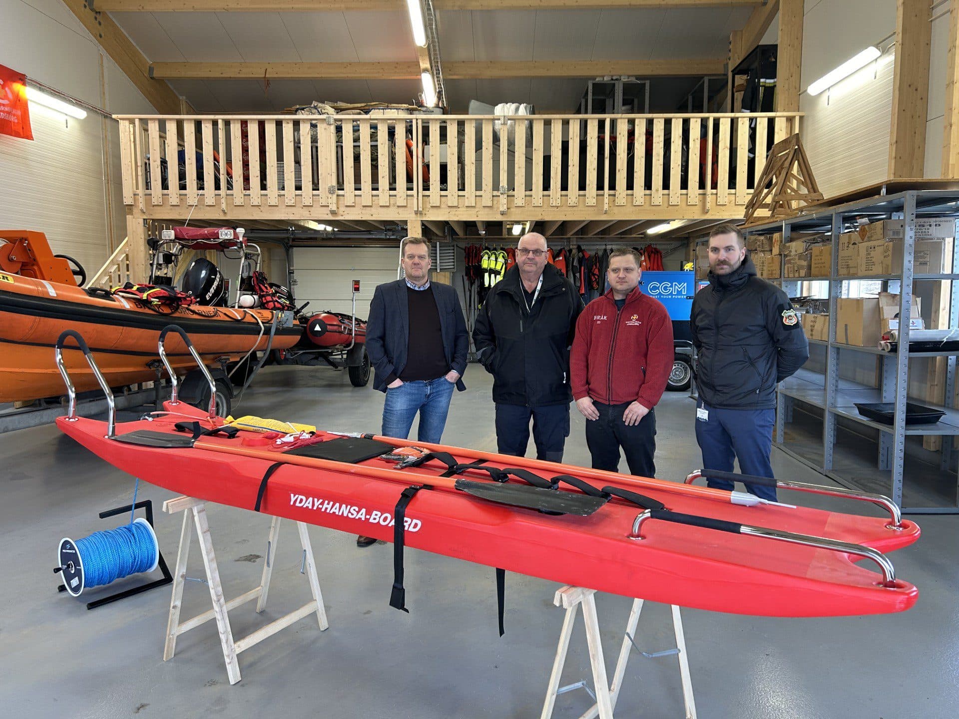 Frá afhendingu flotbrettisins. F.v. Stefán Broddi Guðjónsson sveitarstjóri, Bjarni Kristinn Þorsteinsson aðstoðar slökkviliðsstjóri, Erlendur Breiðfjörð Magnússon formaður bátaflokks björgunarsveitarinnar Brákar og Heiðar Örn Jónsson slökkviliðsstjóri. Ljósm. hig