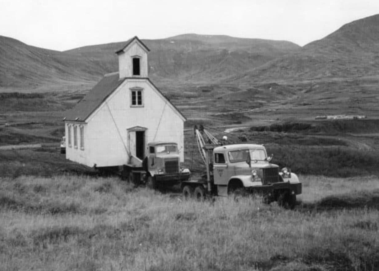 Á FB síðunni Gamlar ljósmyndir eru oft birtar áhugaverðar myndir sem gjarnan skapast líflegar umræður um á spjallþráðum. Þessa mynd birti Eyþór Edvardsson í síðustu viku. Þarna má sjá þegar gamla kirkjan á Saurbæ á Hvalfjarðarströnd var flutt að Vindáshlíð í Kjós þar sem hún stendur enn.