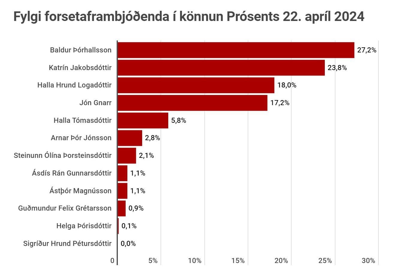 Könnun Prósents fyrir Morgunblaðið var framkvæmd dagana 16.-21. apríl. 2.300 manna úrtak 18 ára og eldri. Svarhlutfall var 53,3%. Gögnin voru vegin til þess að endurspegla lýðfræðilega þætti.