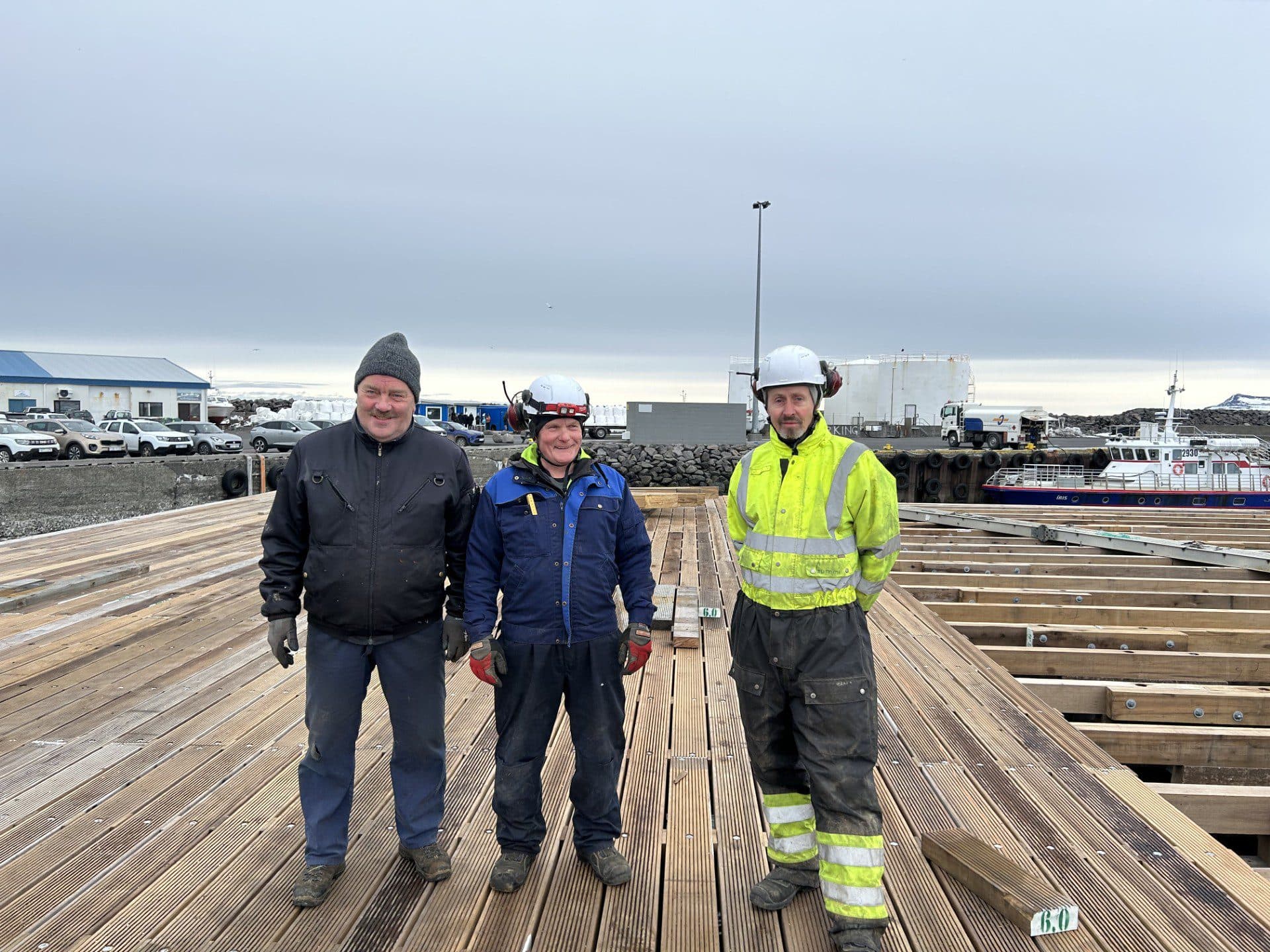 Verktakar við vinnu sína. Frá vinstri eru bryggjusmiðirnir Guðlaugur Einarsson, Björgvin G. Hallgrímsson og Guðmundur Ólafsson. Ljósm. hig