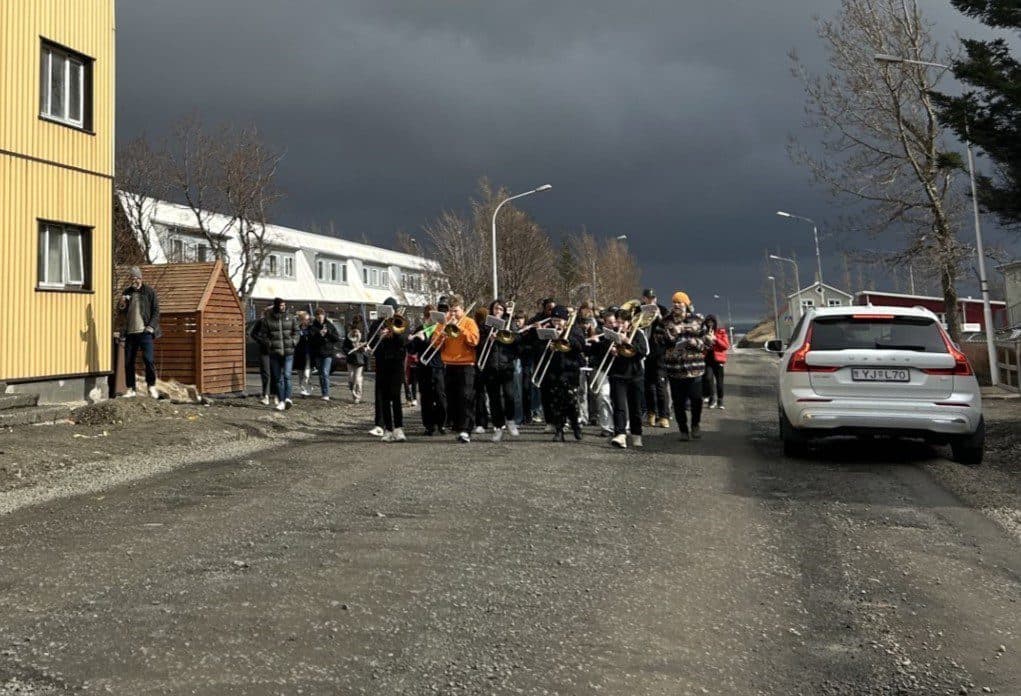 Nýverið var lúðrasveit á rölti niður Borgarbrautina. Ljósm. hig