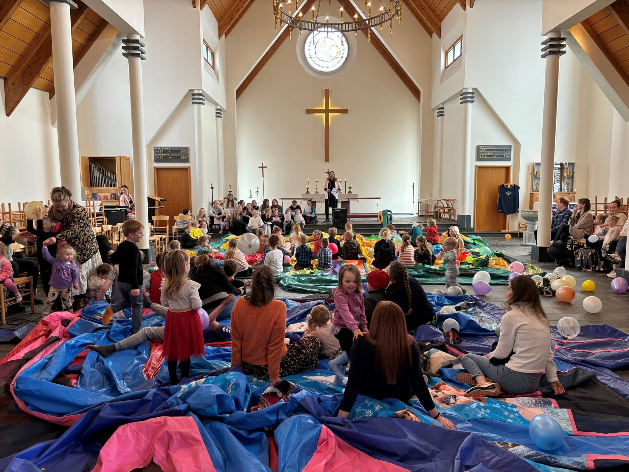 Klukkan 11 í gærmorgun var barnamessa í anda Séra Hildar Bjarkar í Reykholti. Þemað var: „Guð og trú er kaotísk,“ sagði Hildur Björk en af þessu tilefni voru settir upp fjórir hoppukastalar inni í kirkjunni. „Hvað er kaotískara en það?“
