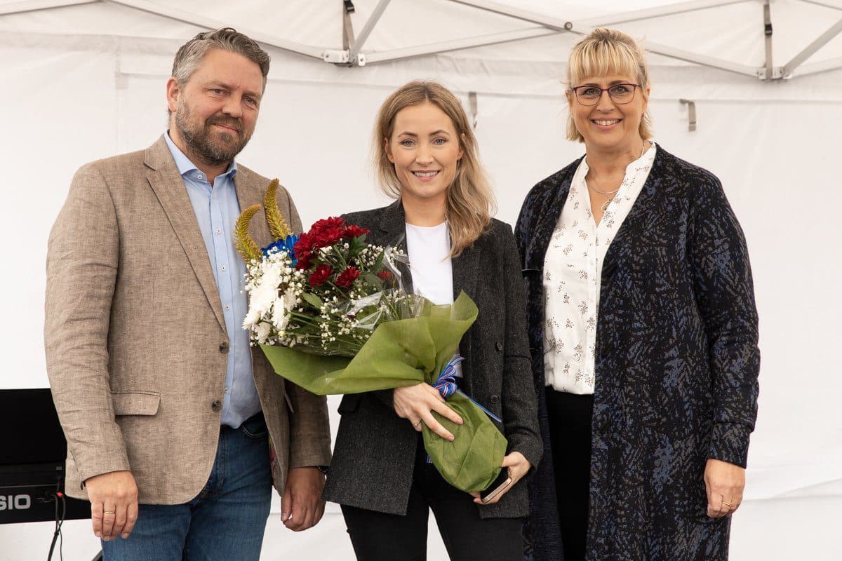 Valgarður Lyngdal, forseti bæjarstjórnar, Eva Björg Ægisdóttir, bæjarlistamaður Akraness 2023 og Guðríður Sigurjónsdóttir, formaður menningar-og safnanefndar. Ljósm. akranes.is