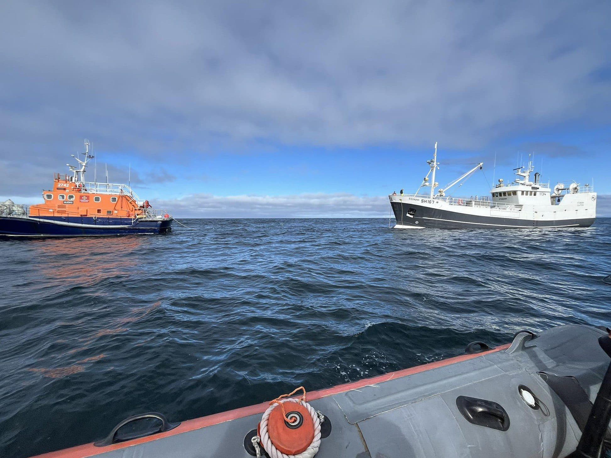 Hér er verið að koma tóg á milli Bjargar og Steinunnar og dráttur að hefjast til Ólafsvíkur. Ljósm. aðsend