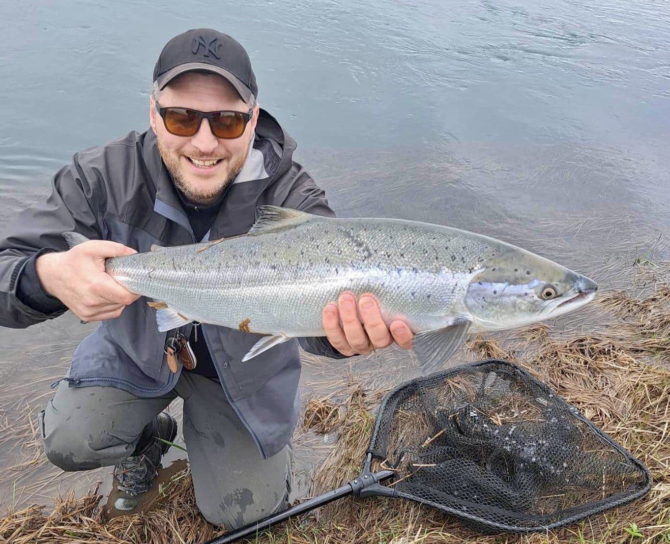 Mikael Marinó Rivera í morgun með fyrsta lax sumarsins í Skugga í Borgarfirði.
