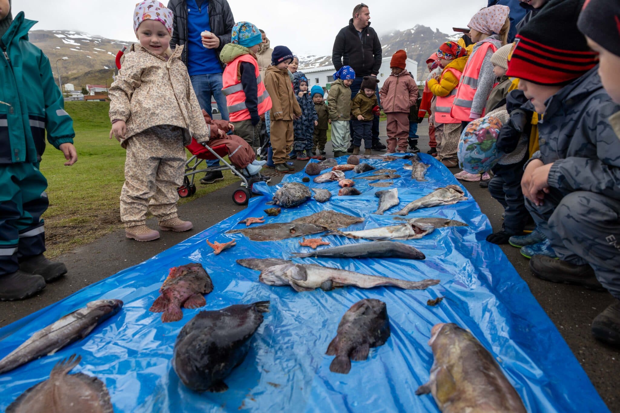 Krökkunum á leikskólanum Sólvöllum gafst kostur á að skoða fiska hafsins á leikskólalóðinni á föstudaginn.