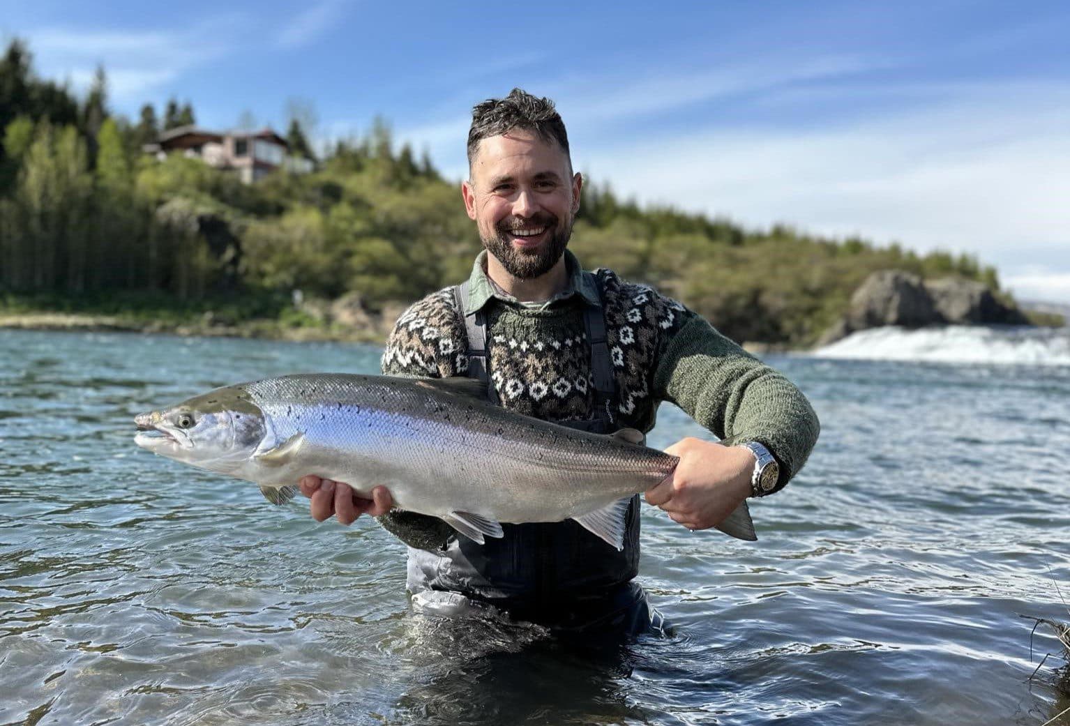 Brynjar Þór Hreggviðsson með flottan lax úr opunarhollinu í Norðurá.