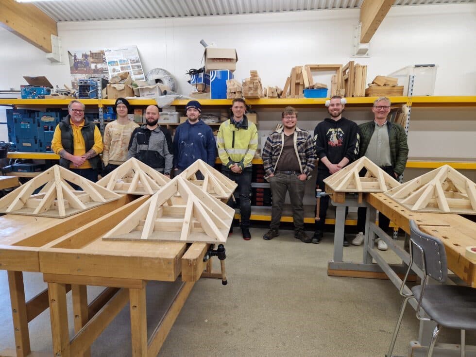Nemendur ásamt kennurum og prófdómara með sveinsstykkið sem var turnþak. Á myndinni frá vinstri eru Ágúst Þór Pétursson prófdómari, Vigfús Kristinn Vigfússon, Michail Sczyrba, Gunnlaugur Hróðmar, Helgi Rafn Rafnkelsson, Guðmundur Sveinn Gunnarsson, Jóhann Snorri Marteinsson og Kristinn Guðbrandsson deildarstjóri á tréiðnaðardeild FVA. Ljósm. fva