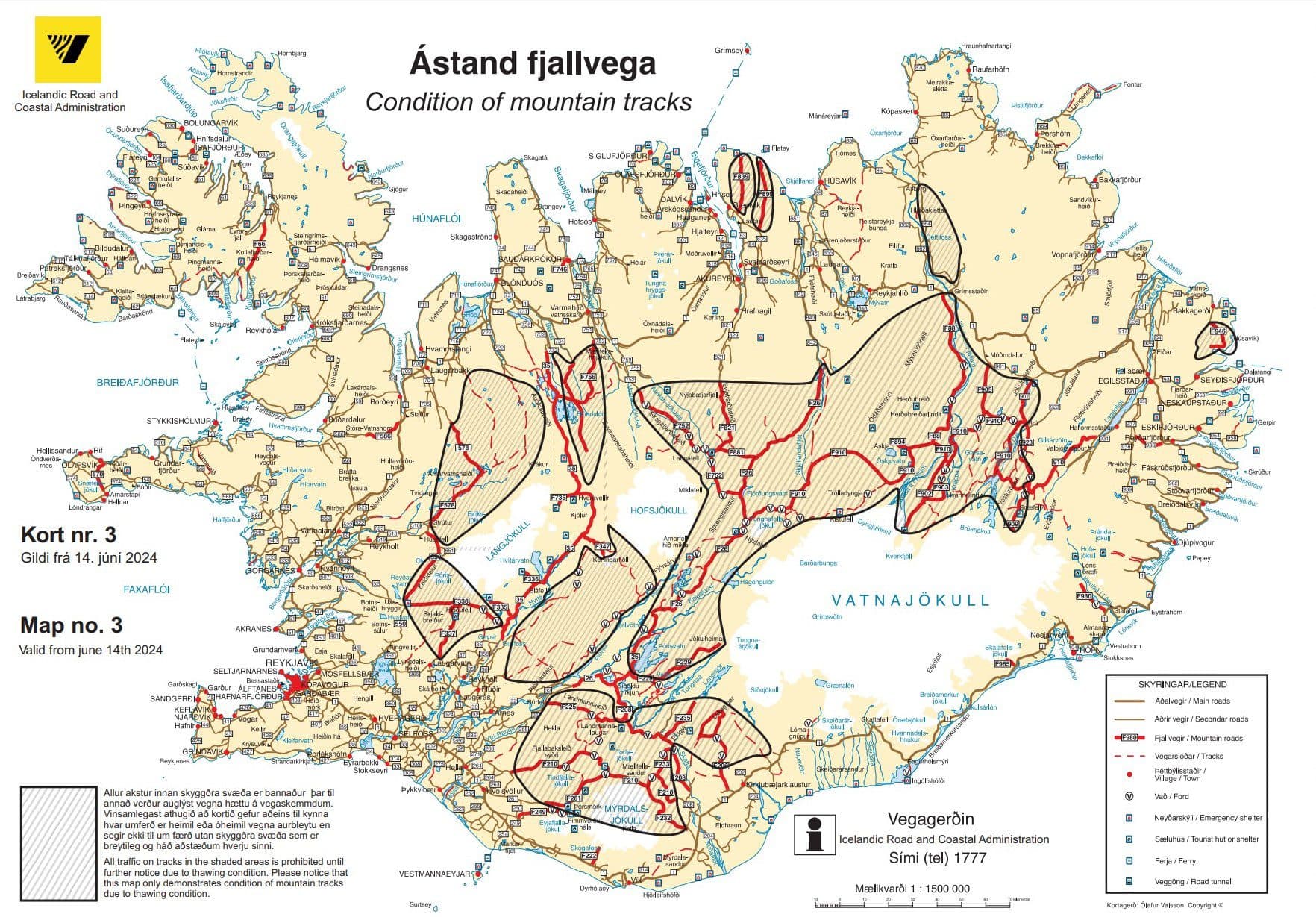 Vegagerðin hefur nú gefið út sitt þriðja Hálendiskort, en á því má sjá hvaða fjall- og hálendisvegir eru lokaðir. Helstu breytingar frá síðustu útgáfu Hálendiskorts eru þær að búið er að opna Lakaveg (F206) upp að Fagrafossi en yfir Kjöl (35) er einungis fært fjallabílum norðan Kerlingarfjalla. Búið er að opna Fjallabaksleið nyrðri (208) frá Sigöldu og að Landmannalaugum. Þá er búið að opna Fjallabaksleið nyrðri (F208) upp að Hólaskjóli að austan. Hér um vestanvert landið er búið að opna syðsta hluta vegarins á Arnarvatnsheiði (F578), þ.e. milli Surtshellis og Úlfsvatns. Arnarvatnsheiði er að öðru leyti ófær enda mikil aurbleyta þar víða og klaki ekki farinn úr jörðu. Vegurinn um Kaldadal er einnig lokaður.