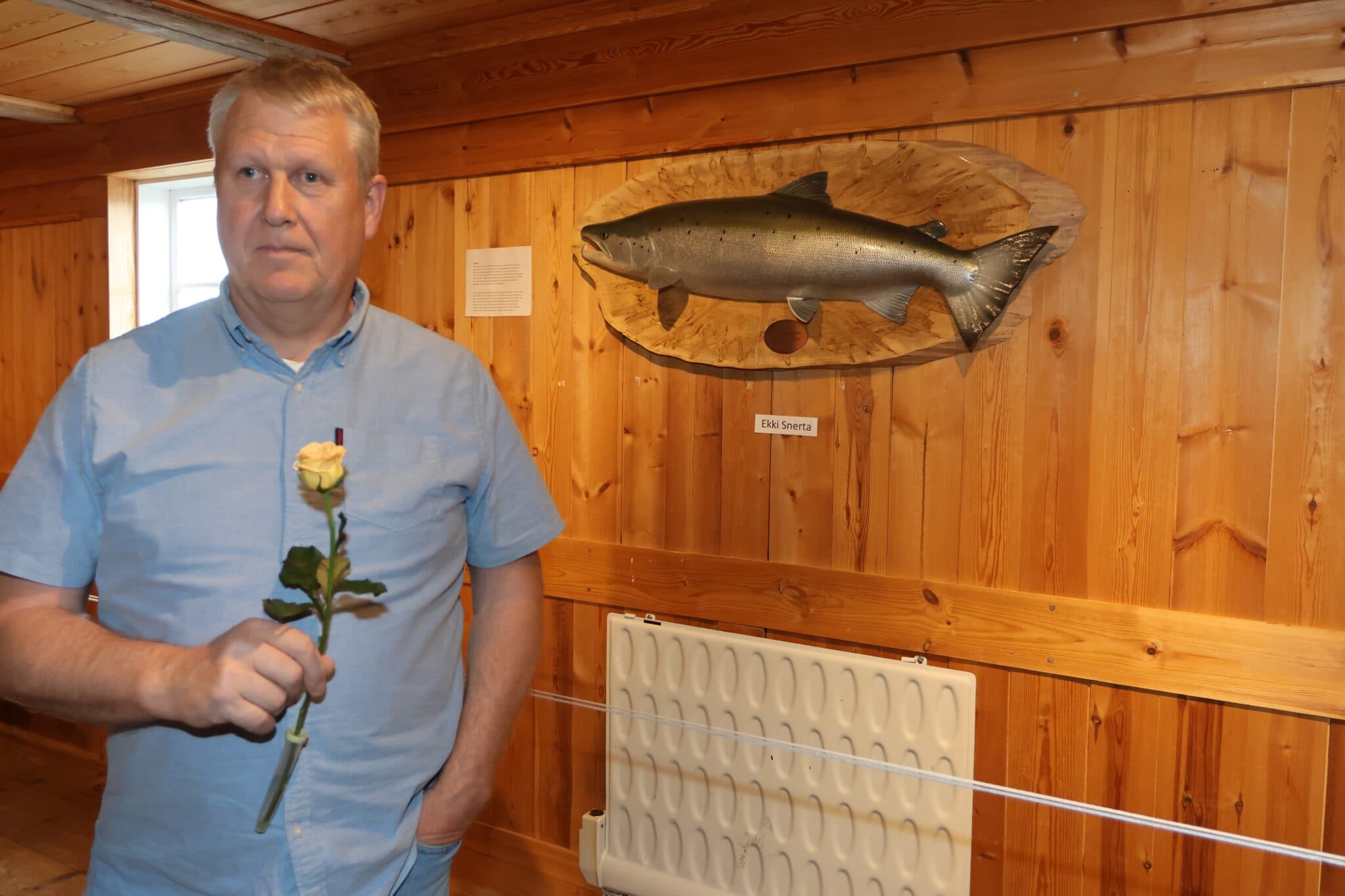 Vagn með laxinn fræga sem hann sendi til USA til málunar. Ljósmyndir: af