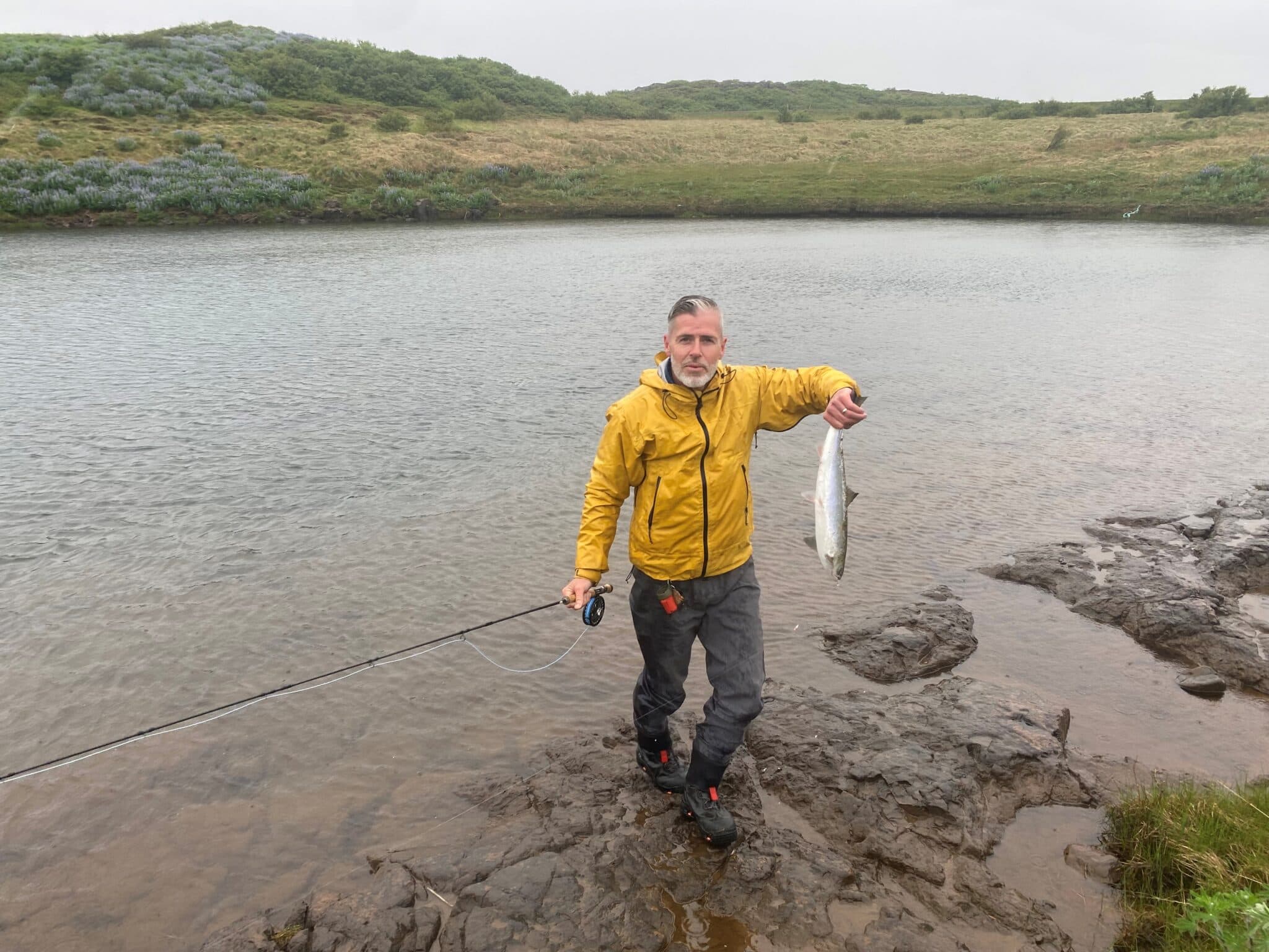 Fyrsti laxinn veiddist í Langá á Mýrum í morgun. „Já, hann tók fluguna Iðuna. Ég hef oft fengið lax á hana hérna í byrjun veiðitímabils; hún er sterk þá,“ sagði Sigurjón Gunnlaugsson við Langá á Mýrum. Áin var formlega opnuð í morgun en þessi fiskur var númer tvö í ánni á land, fjögurra punda hrygna. Smálaxinn er því mættur snemma í ána þetta árið, en stærri fiskar voru að stökkva þar sem veiðimenn köstuðu flugunni við ána. En lax hefur fyrir nokkru sést og það boðar gott fyrir sumarið.