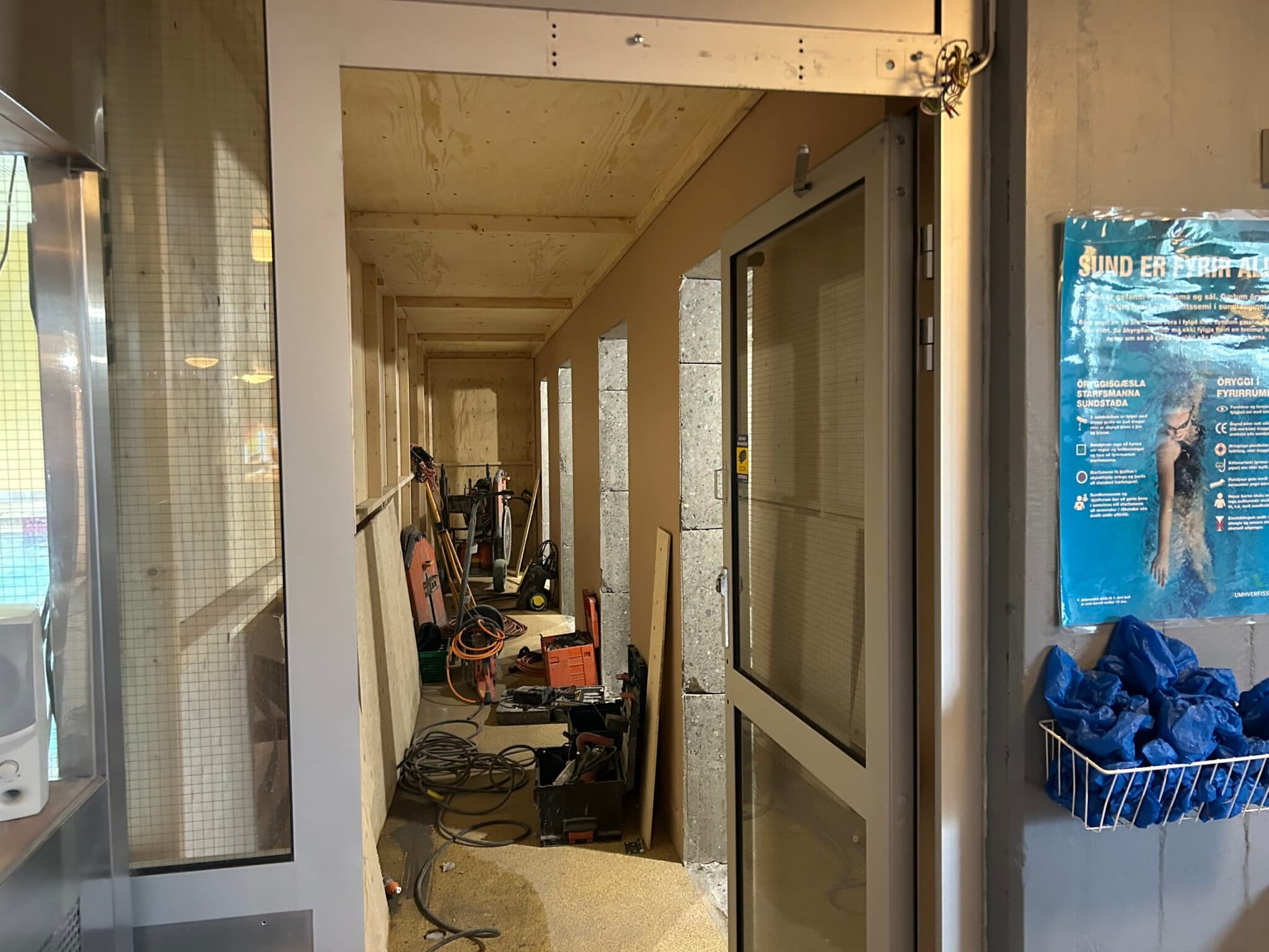 Töluverðar framkvæmdir eru nú í gangi innan dyra í íþróttamiðstöðinni í Borgarnesi. Stækka á kvennaklefa og útbúa sérklefa fyrir sundlaugargesti en ekki er komin tímasetning hvenær verkinu lýkur. Nú á sunnudaginn verður innilaugin tæmd og verður hún lokuð næstu tvær til þrjár vikurnar. Eftir að Landsmóti UMFÍ lýkur og stækkun kvennaklefa verður lokið er stefnan að stækka karlaklefa fyrir sundlaugargesti.