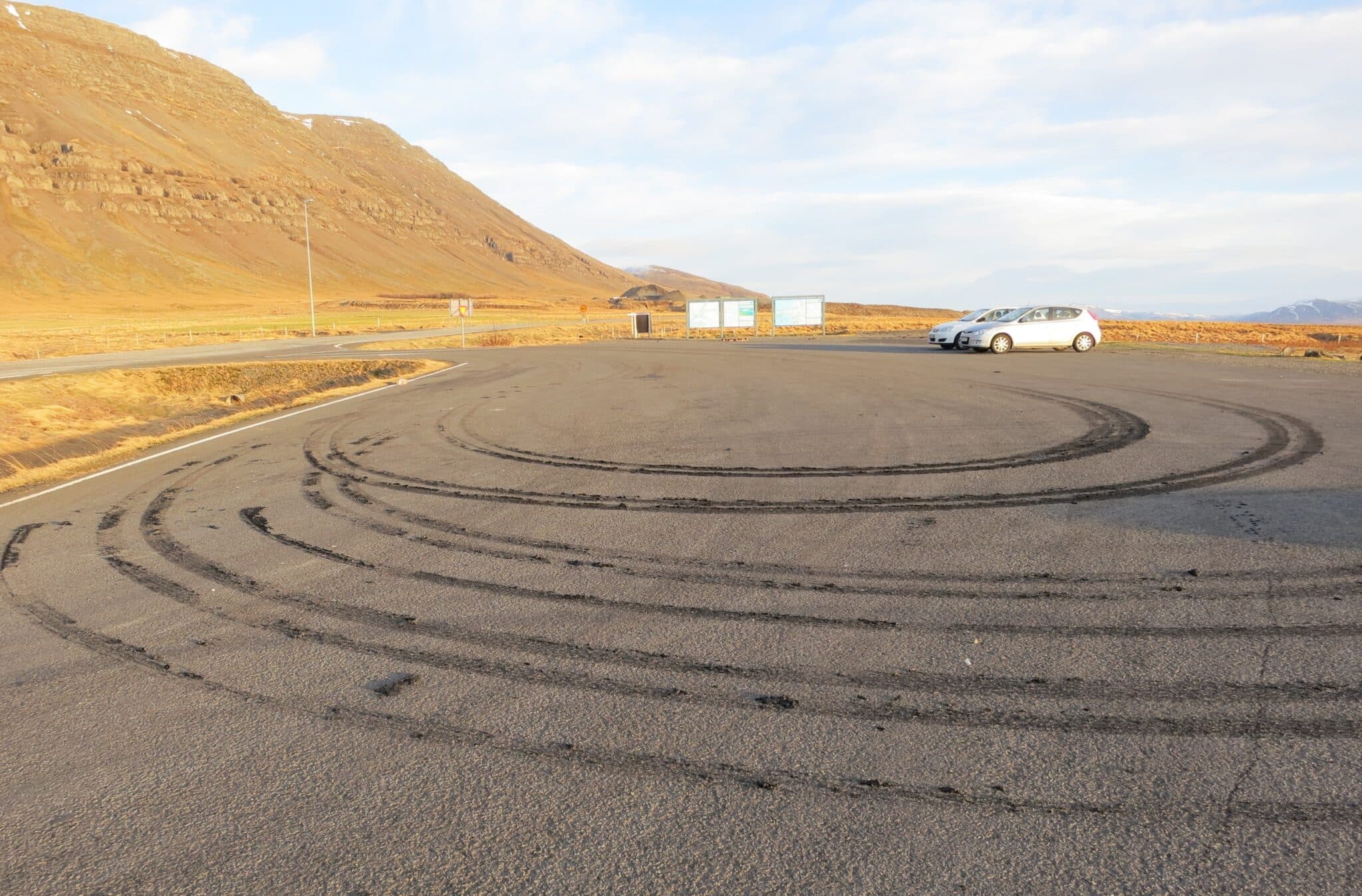 Dæmi um blæðingu í malbiki á bílastæði nærri Hvalfjarðargöngum. Ljósm. úr safni