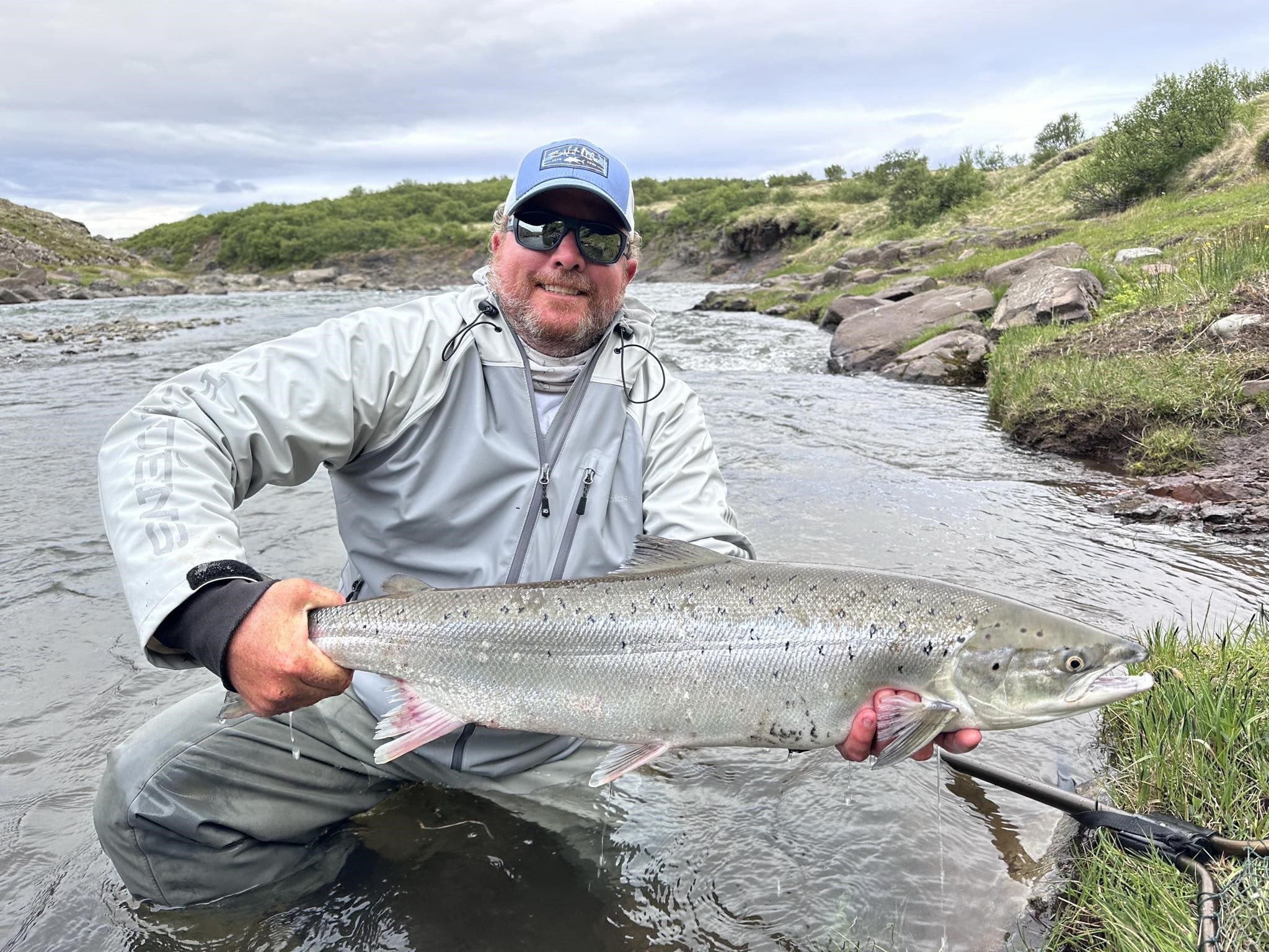 Þessi ameríski veiðimaðurinn fékk meðal annars tvo laxa í Skiptafljóti í Þverá; 90 sentimetra og 98 sentimetra, afar fallega fiska.