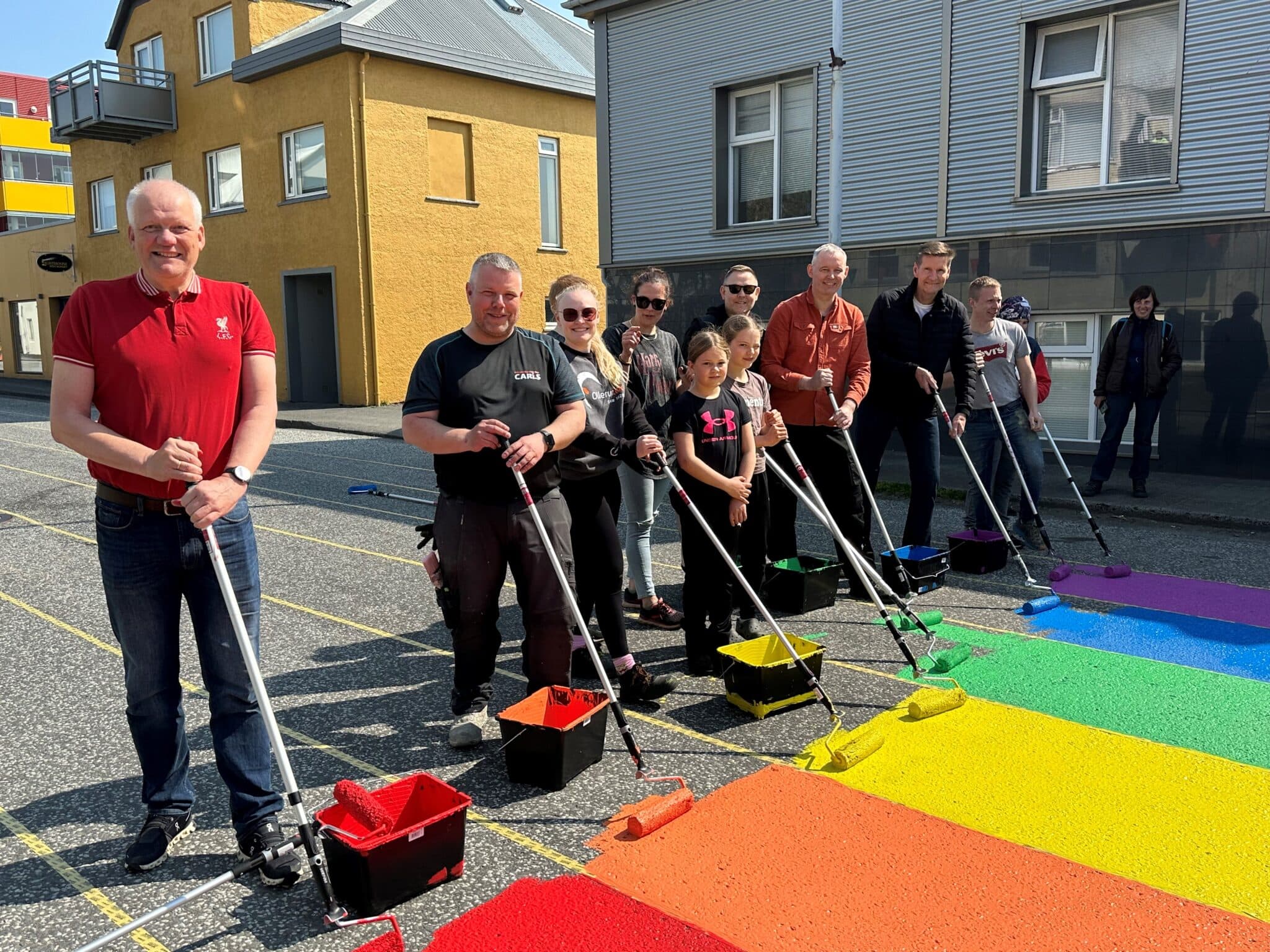 Það var vaskur hópur fólks sem var mættur á laugardagsmorgun á Akratorg á Akranesi. Blíðskaparveðri hafði verið spáð og ákveðið að mála að nýju í liti fjölbreytileikans Kirkjubrautina frá torginu og upp að næstu gatnamótum. Nokkur fyrirtæki og félagasamtök lögðu verkefninu lið með því að kosta einn lit hvert og voru fulltrúar þeirra mættir til að mála.
