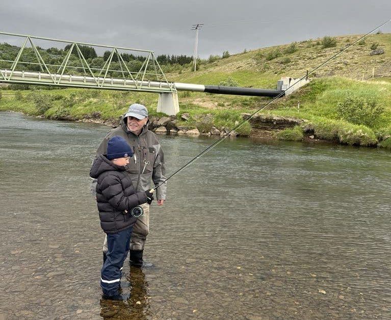 Holl þeirra Birgis og Hilmars fékk sjö laxa þennan dag. Hér kennir Birgir afastráknum sínum réttu tökin. Ljósm. aðsend