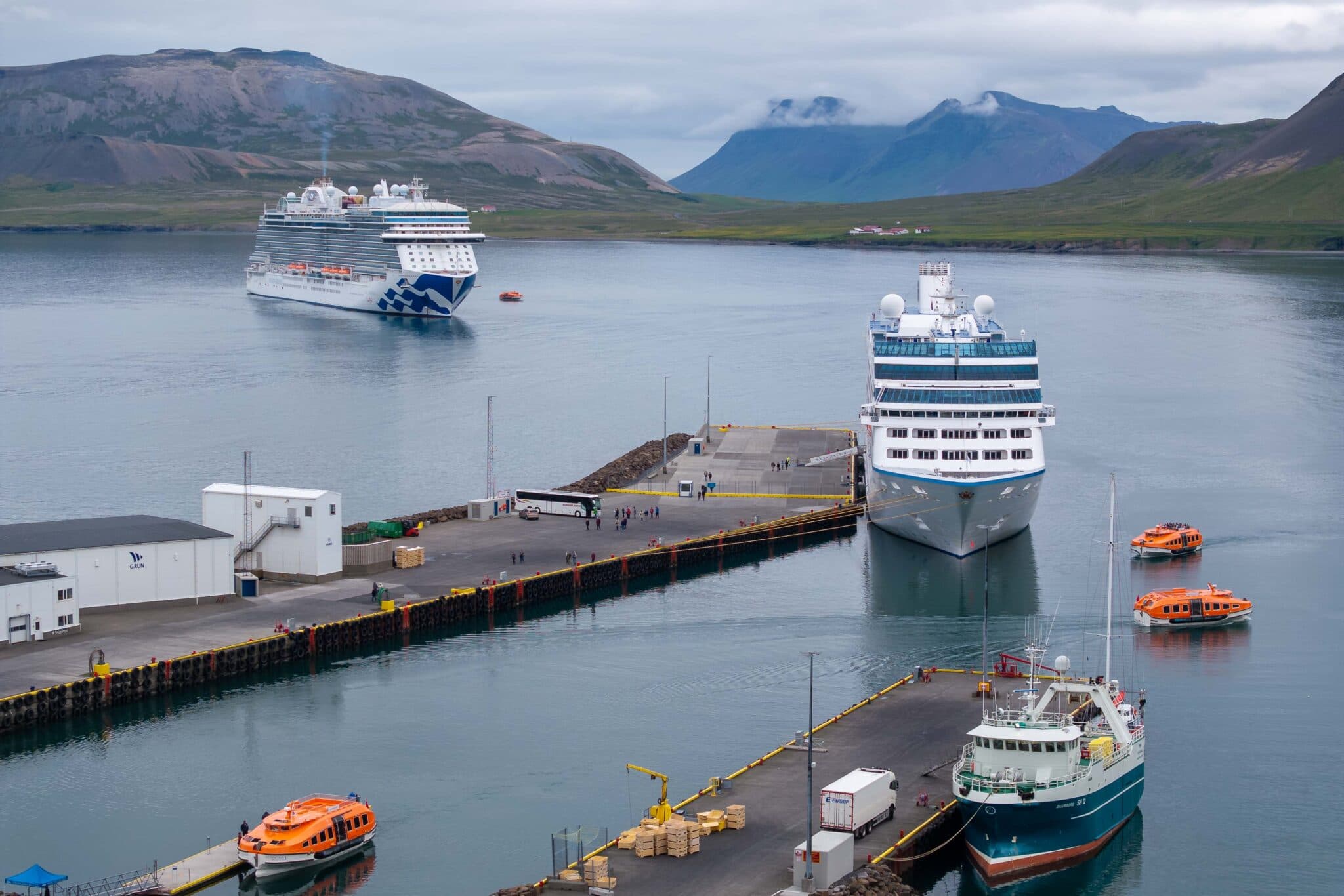 Skipin Sirena og Sky Princess ásamt litlu farþegabátunum sem flytja fólkið í land frá Sky Princess. Ljósm. tfk