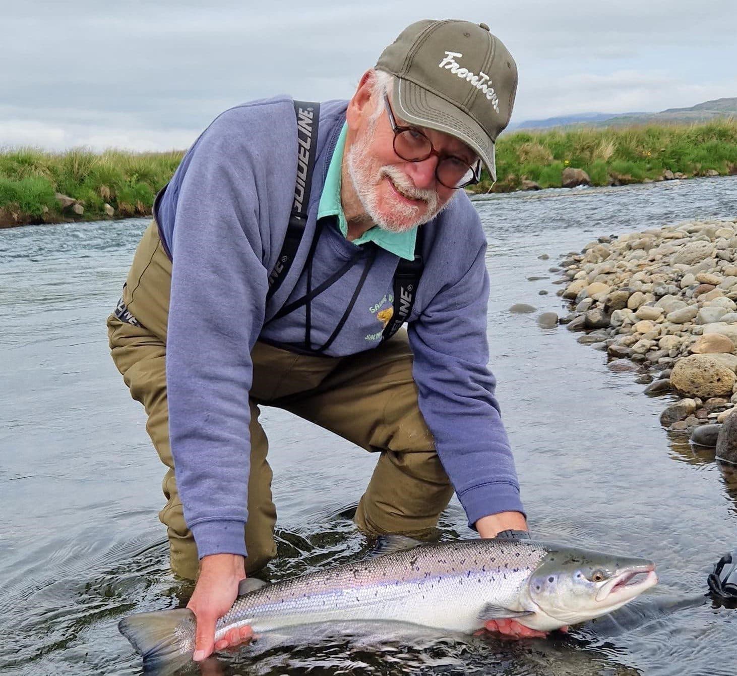 Erlendur veiðimaður með lax á Norðtungueyrum í Þverá.