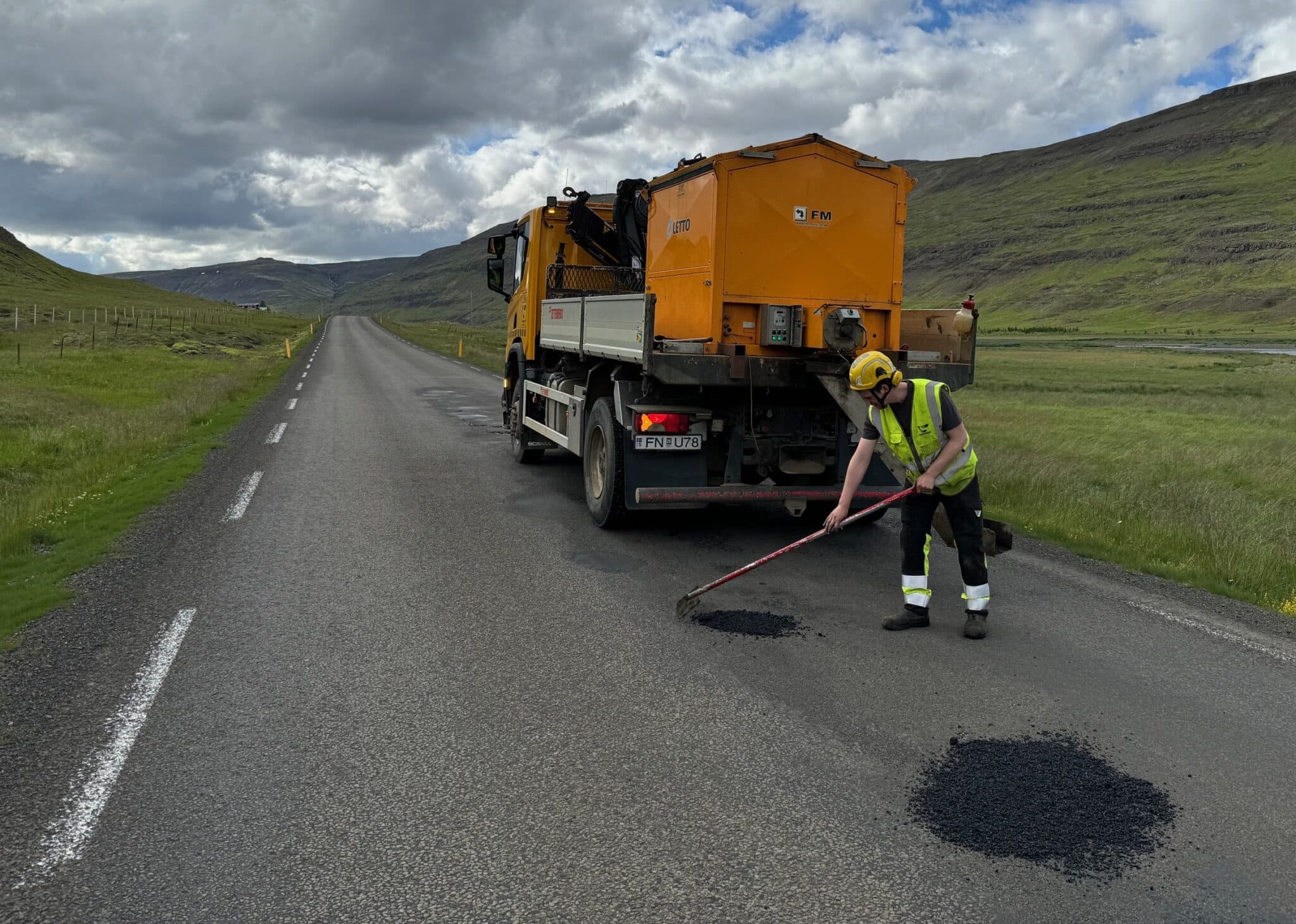 Starfsfólk Vegagerðarinnar að setja í holur í Miðdölum. Ljósmyndir: hig