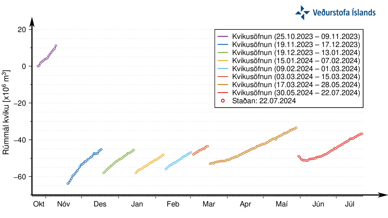 Kvikusöfnun undir Svartsengi er stöðug ef horft er til síðustu vikna, segir í tilkynningu frá Veðurstofunni. „Líkur eru á nýju kvikuhlaupi og jafnvel eldgosi á næstu tveimur til þremur vikum. Landris heldur áfram og hefur kvikusöfnun undir Svartsengi verið nokkuð stöðug ef horft er til síðustu vikna. Talið er að á bilinu 13 til 19 milljón rúmmetrar af kviku þurfi nú að bætast við undir Svartsengi frá síðasta gosi til að koma af stað nýju kvikuhlaupi og jafnvel eldgosi. Samkvæmt líkanreikningum er líklegast að magnið sem bæst hefur við frá síðasta eldgosi nálgist 16 milljónir rúmmetra á næstu dögum. Hættustig hefur verið hækkað í ljósi nýjustu gagna og sviðsmyndir uppfærðar.“ Þá telja sérfræðingar aukna líku á að hraun gæti brotið sér leið innan varnargarða við Grindavík um sprungur sem opnuðust í skjálftunum í nóvember.