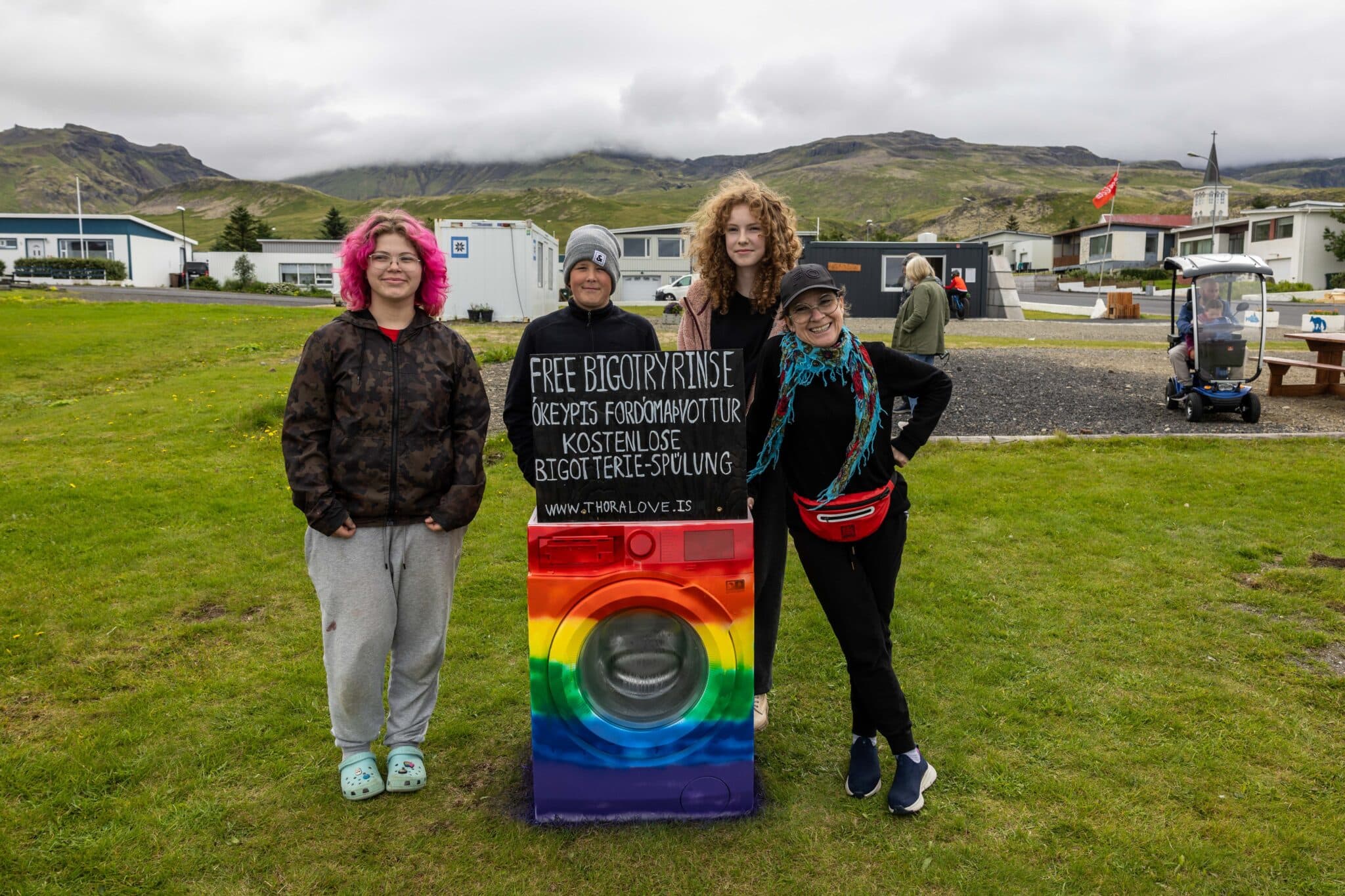 F.v. Steinunn Cecilía Steinarsdóttir, Sindri Snær Hinriksson, Mýrún Lotta Loftsdóttir Klee og Thora Karlsdóttir við fordómaþvottavélina. Ljósm. tfk