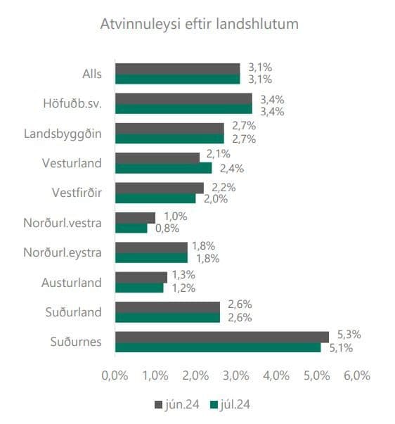 Í nýútgefinni skýrslu frá Vinnumálastofnun má sjá að skráð atvinnuleysi á landsvísu í júlí á þessu ári var 3,1% miðað við 2,8% í fyrra. Atvinnuleysi mælist mest á Suðurnesjum en minnst á Norðurlandi vestra og á Austurlandi. Atvinnuleysi hækkaði á einum stað á landinu frá júní, en það er á Vesturlandi þar sem atvinnuleysi fór úr 2,1% í 2,4% í júlí. Þar gætu uppsagnir í kjölfar gjaldþrots Skagans 3X átt hlut að máli.