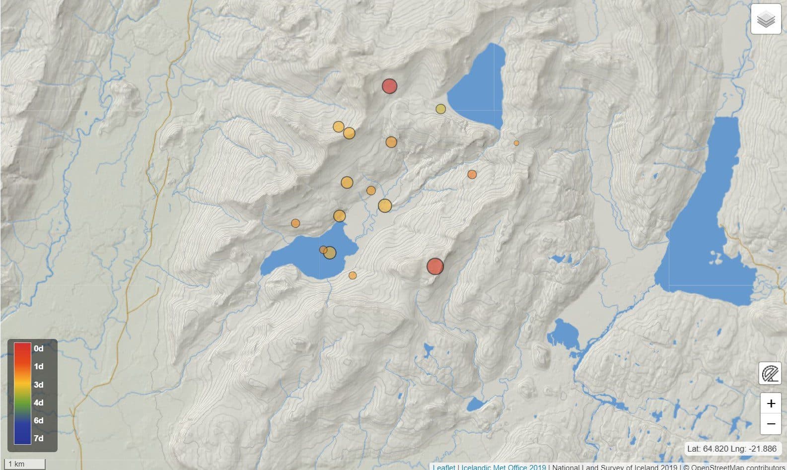 Rauðu punktarnir merkja nýjustu skjálftana sem voru síðdegis í gær. Til hægri er Langavatn, efst er Hítarvatn, neðsta vatnið er Grjótárvatn en mitt á milli þessara vatna er Háleiksvatn.