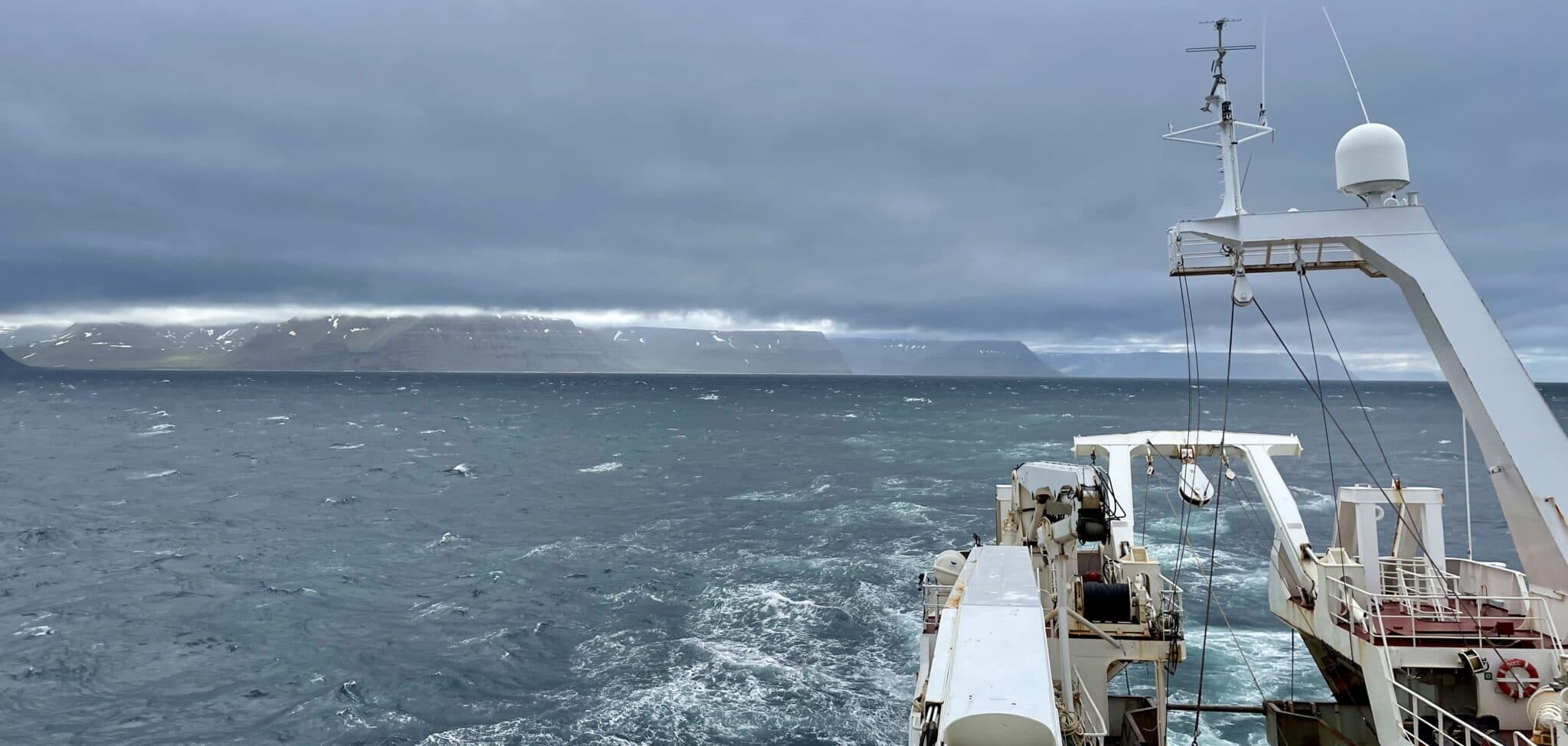 Útsýnið frá Árna Friðrikssyni á vetrarlegum sumardegi út af Vestfjörðum í byrjun júlí. Ljósm. Anna Heiða Ólafsdóttir leiðangursstjóri