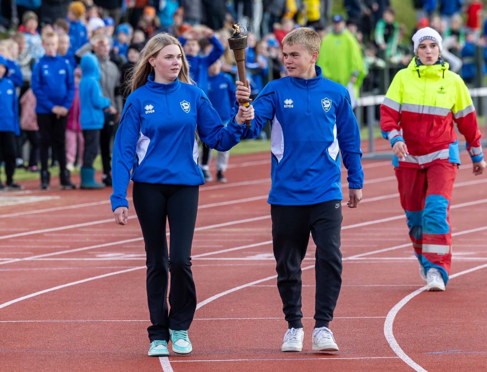 Kyndilberar við upphaf mótsins. Heimafólkið Kristín Eir Holaker Hauksdóttir hestaíþróttakona og Sindri Karl Sigurjónsson hlaupari halda á kyndlinum. Ljósm. tfk