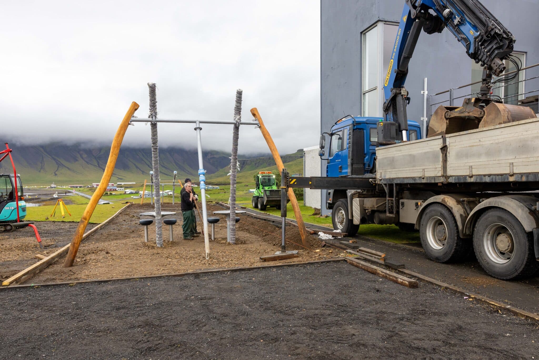 Starfsmenn Grundarfjarðarbæjar setja upp nýja aparólu á leikvellinum. Ljósm. tfk