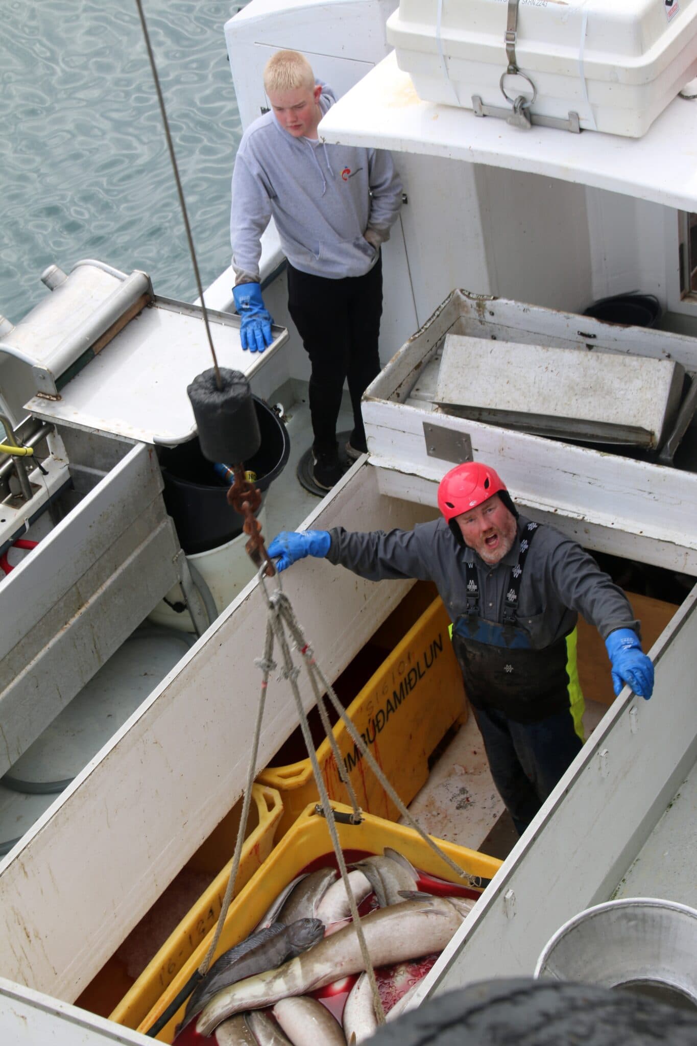 Magnús Emanúelsson og Hrannar að landa afla dagsins. Ljósm. AF